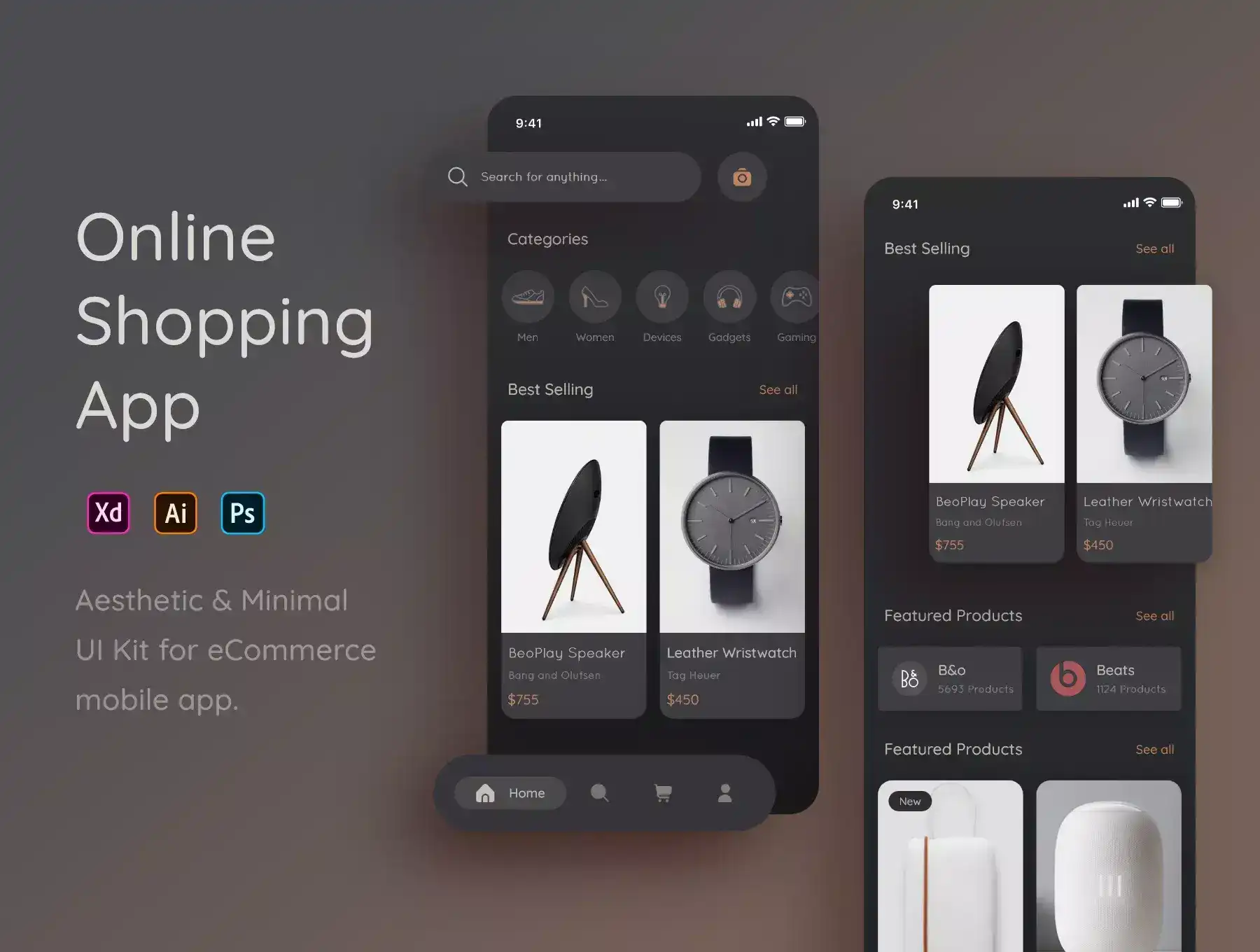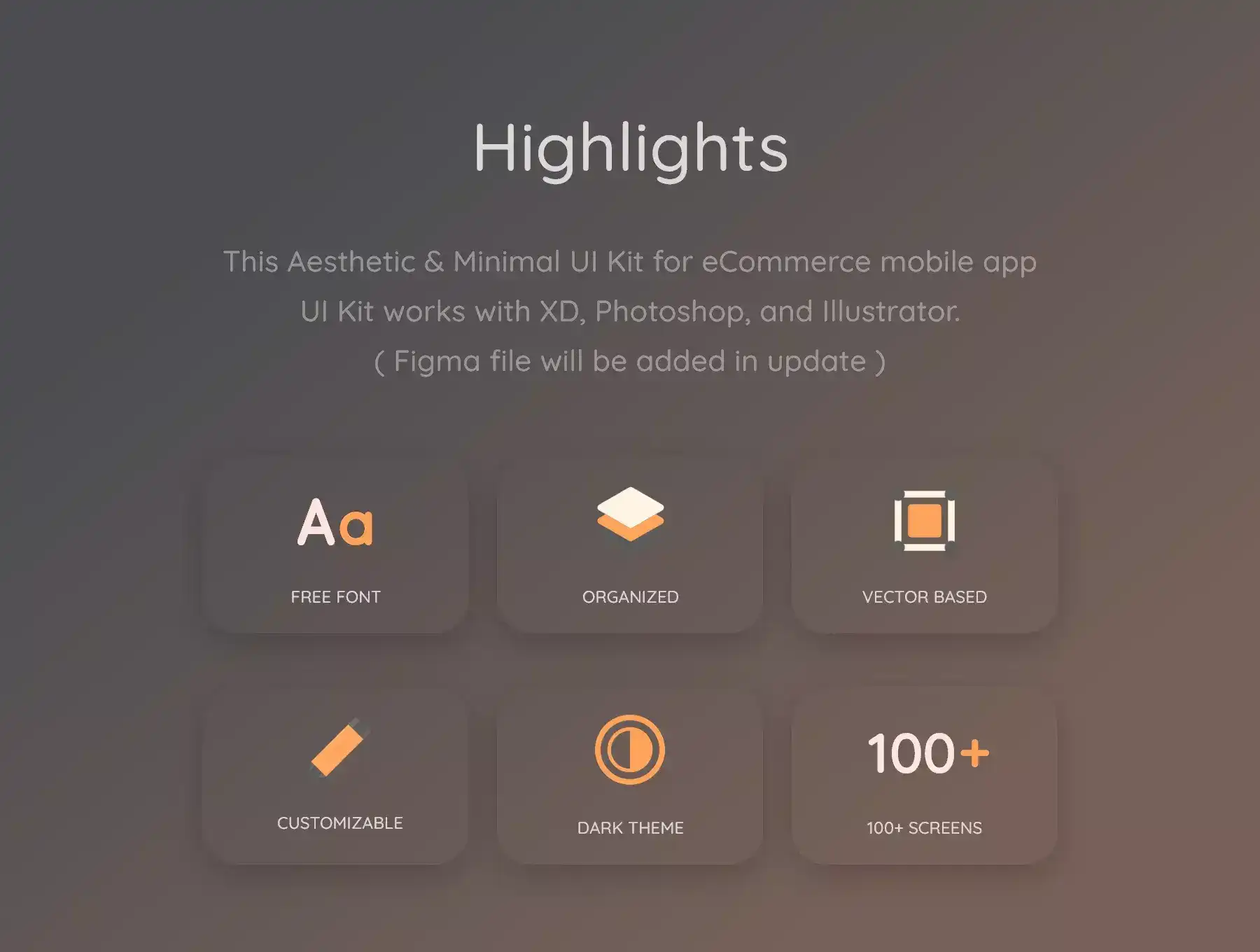 This Aesthetic & Minimal UI Kit for eCommerce mobile app UI Kit works with XD, Photoshop, and Illustrator.( Figma file will be added in update )