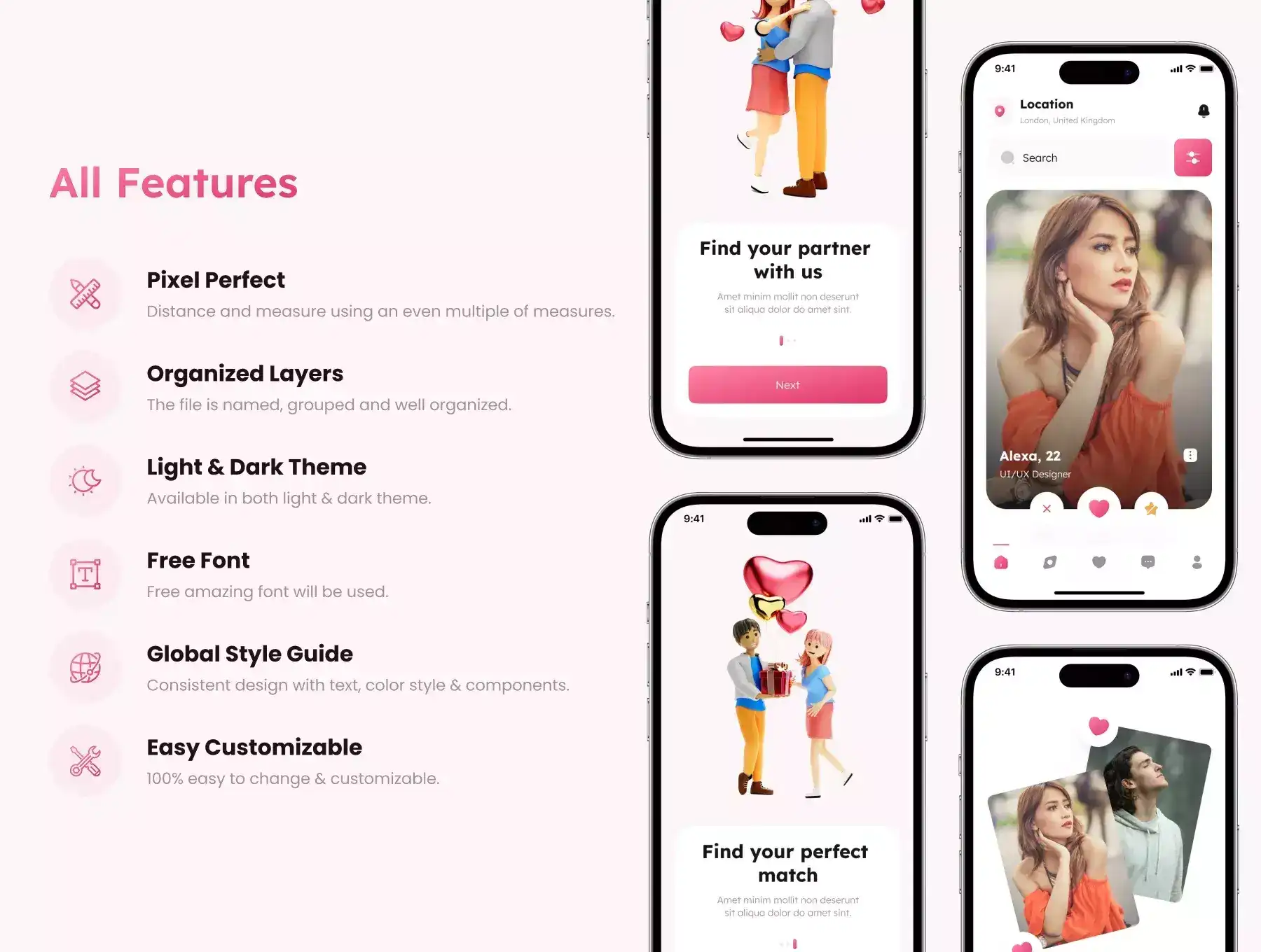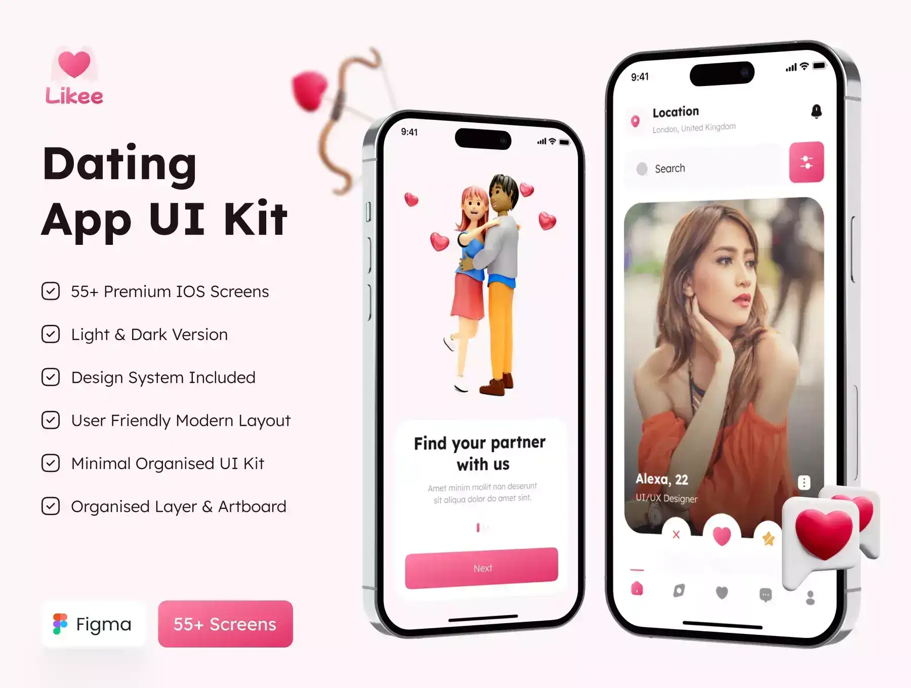 Likee is a Dating App UI Kit consisting of 55+ pixel-perfect screens and easy to use in Figma.