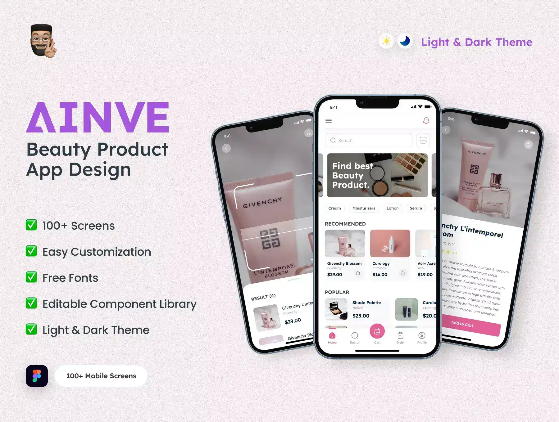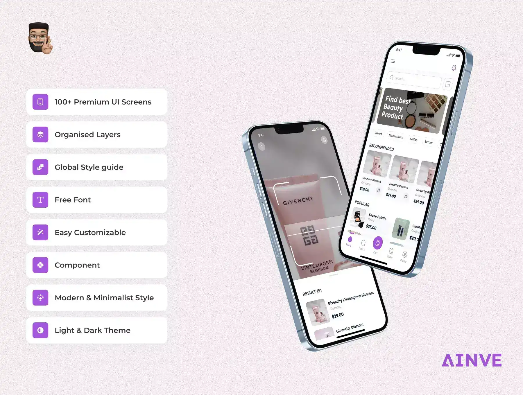 Ainve Beauty Product App Design is a women's Beauty product-based App Design. includes 100+ iOS screen templates designed with Figma. With Modern & Minimalist Style iOS UI Kit you can easily develop your projects and speed up your design workflow.