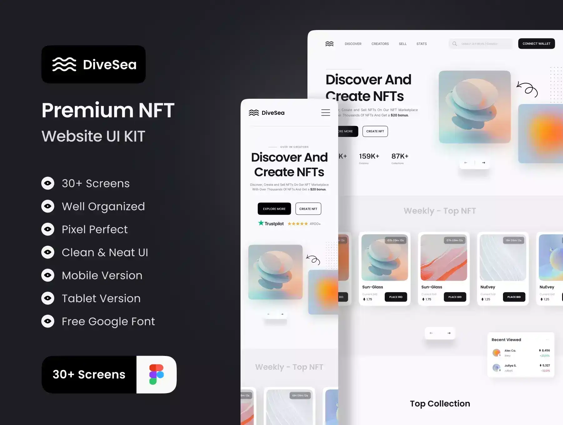 DiveSea is a Premium and High-Quality NFT Market Landing Page UI Kit With 30+ High-Quality Screens And Easy To Use In Figma Crafted With Love And UX Friendly Design.