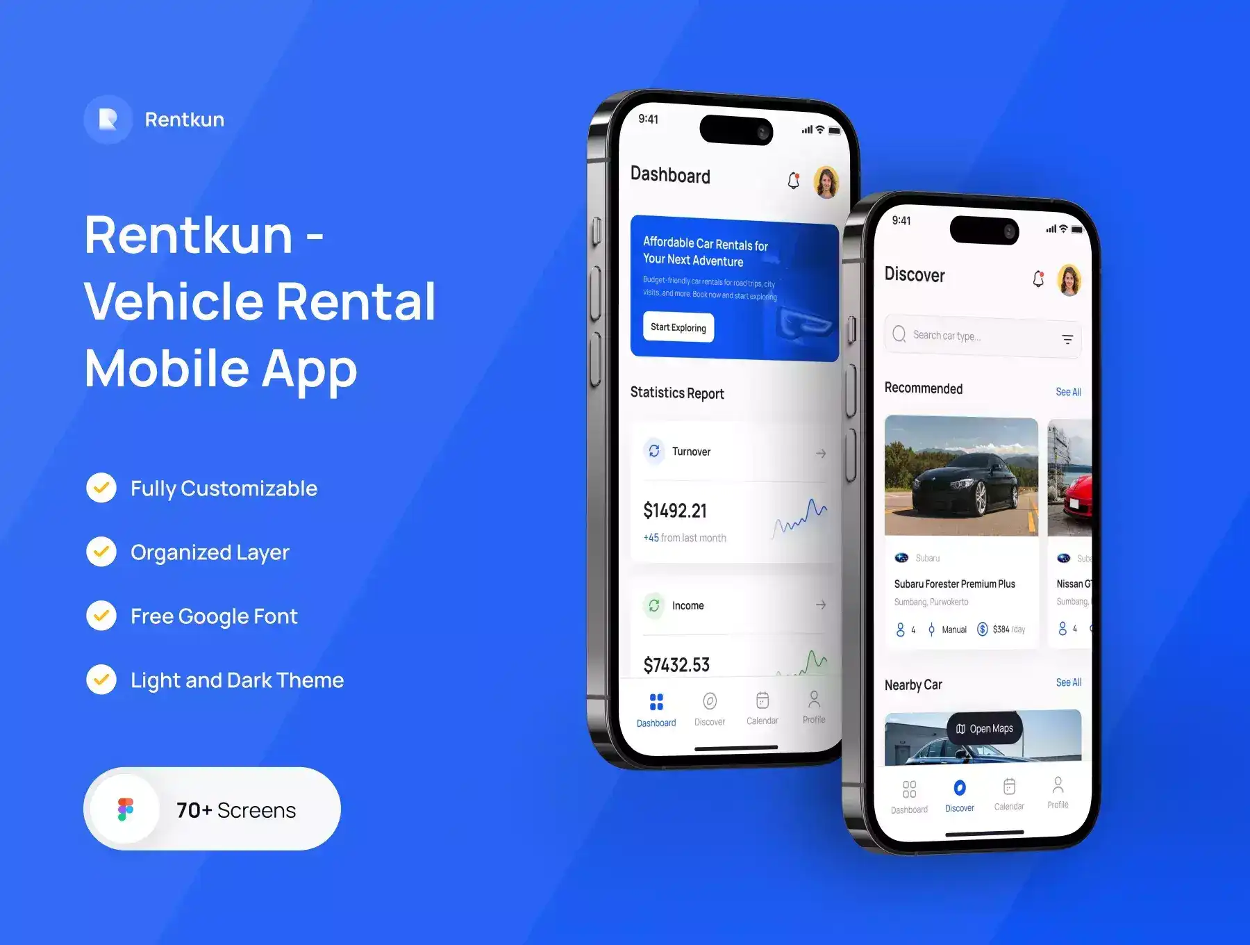 Rentkuy is Vehicle Rental Mobile App UI Kit with 70++ high-quality screens and is easy to use with clean, neat, and modern design. Available Light & Dark theme in Figma file.