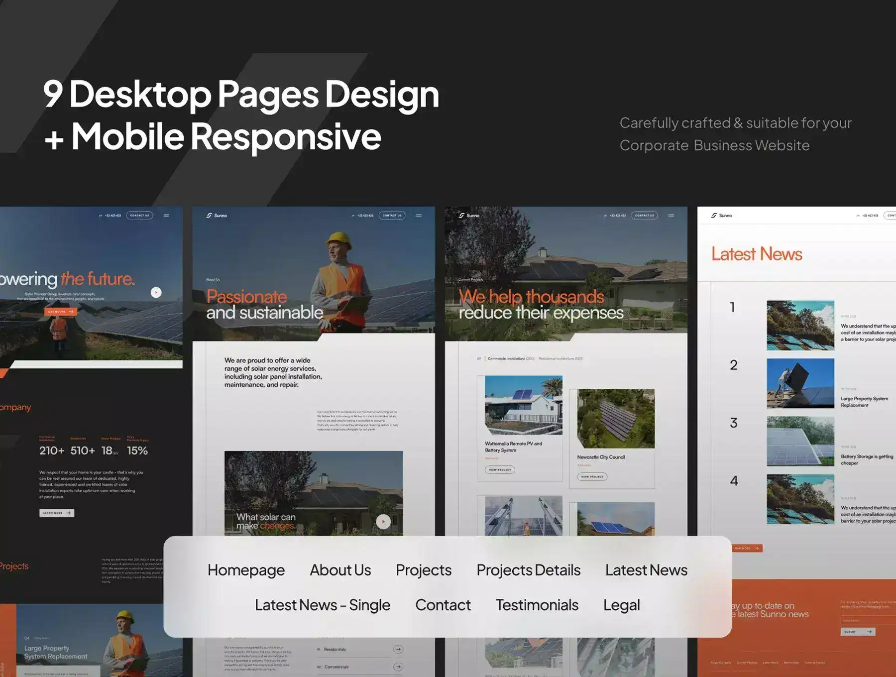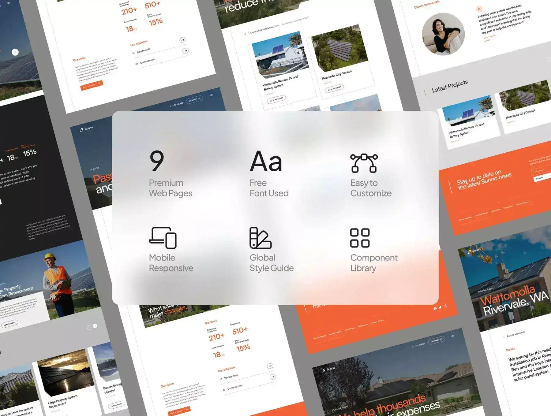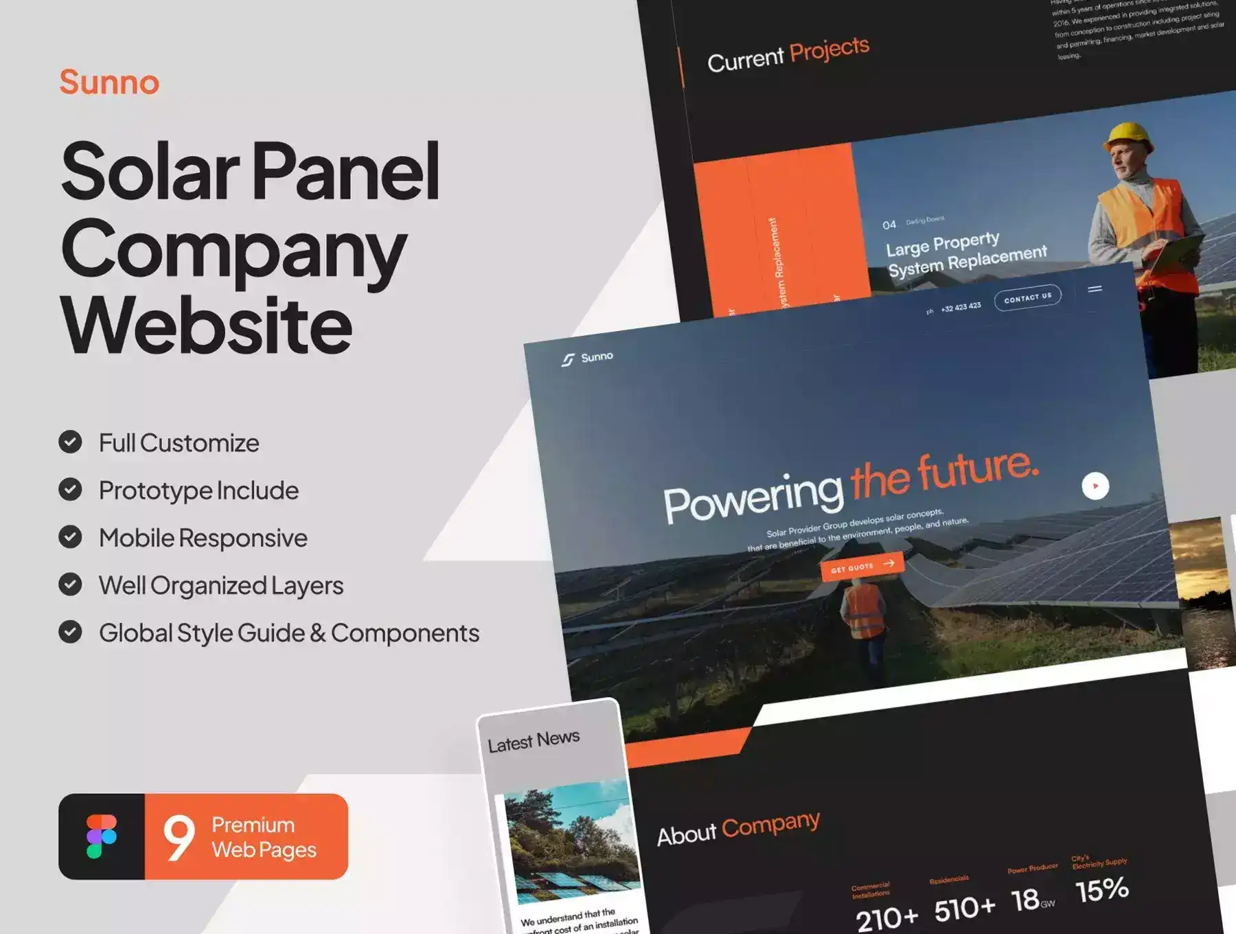 This is our new product called Sunno. It's 9 Premium web page design for solar panel provider company or corporate business. Concept is easy to edit, customize, and resize, because of vector shapes, and very well organized layers.