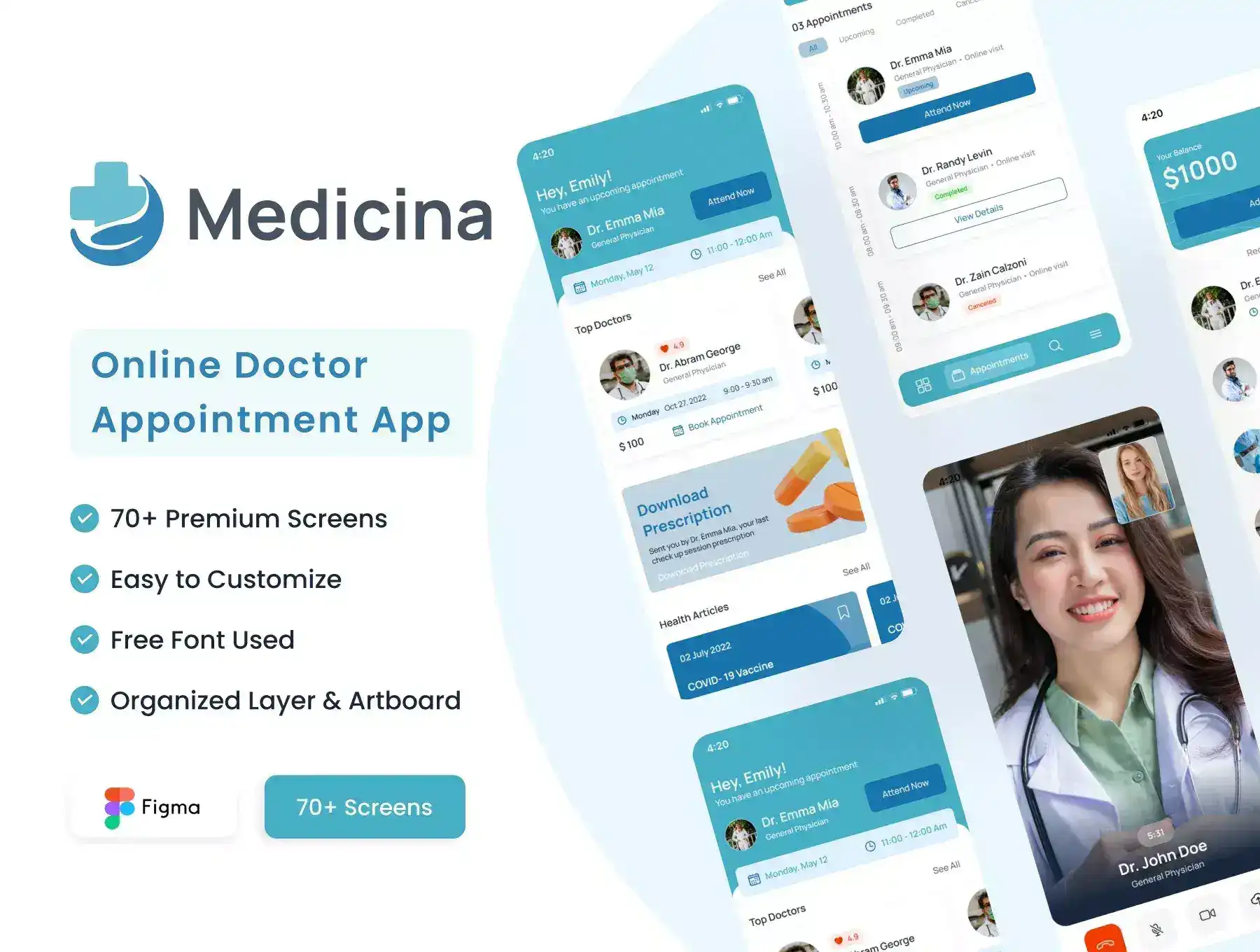 Medicina- is a Online Doctor Appointment App UI KIT with a modern minimalistic design and contains 70+ high-quality screens. This modern design template is easy to customize with global color and text style.