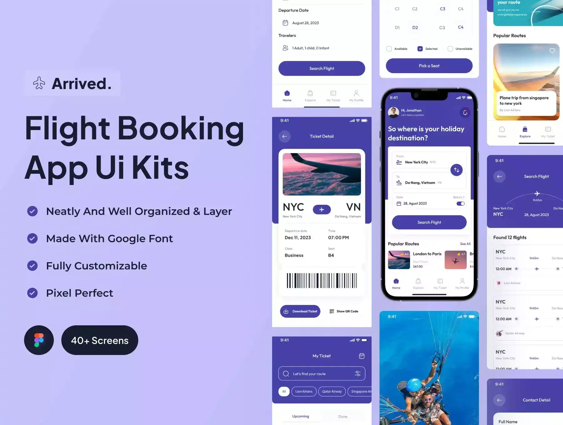 Arrived Minimaslist design UI Kits for Flight Booking Apps with 40+ screens.
