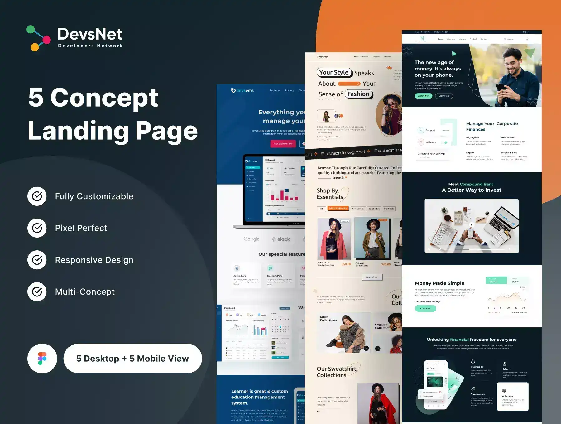 A complete range of landing pages for E-commerce, Health, Digital Service Agencies, Fintech Services and Education Management. A perfect design that will suit your business growth. Landing pages built for Figma that will help you work faster and better than ever.