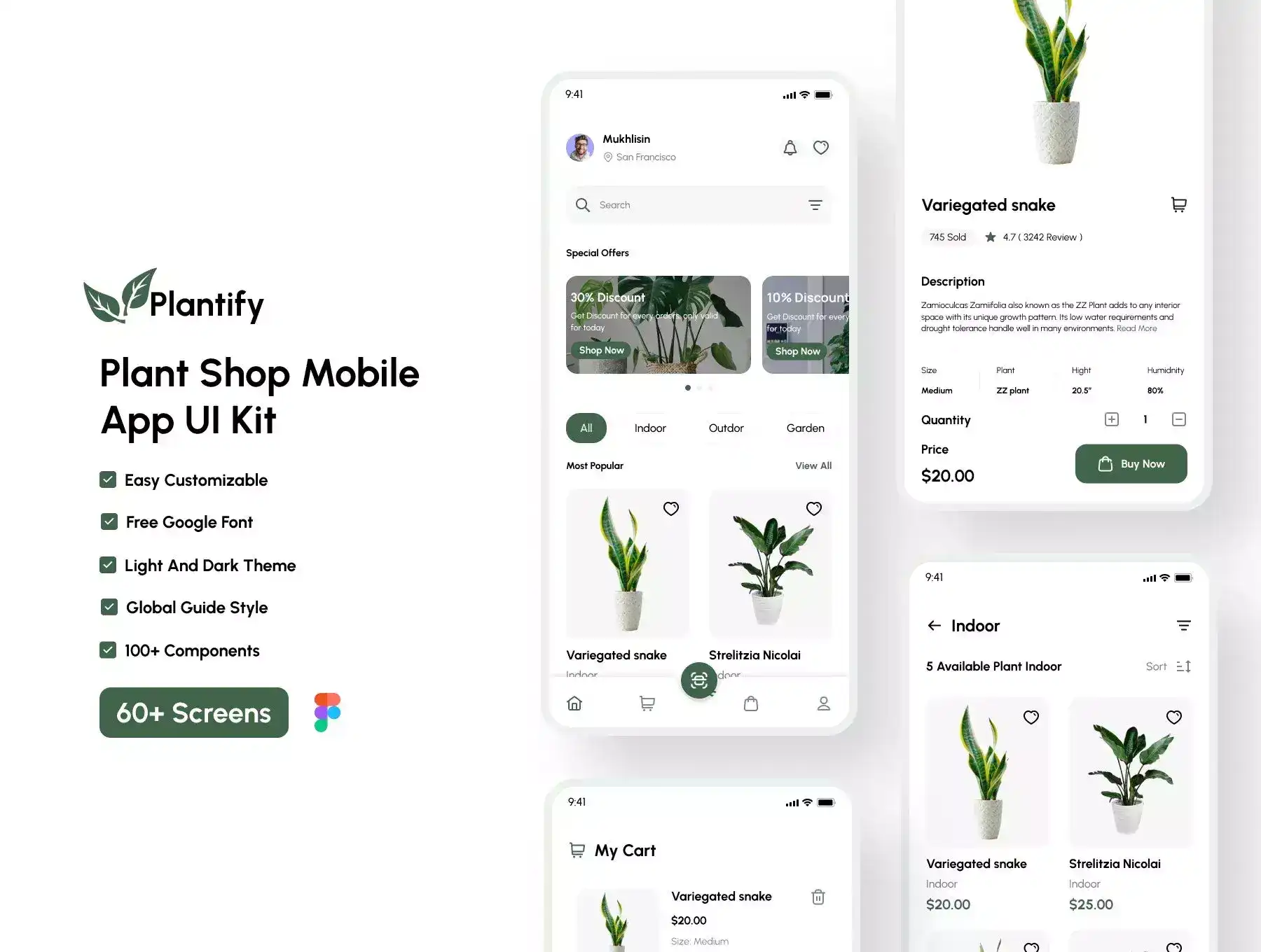 Plantify is a premium Plant Store Mobile App UI Kit containing 60+ high-quality screens and easy to use in Figma.
