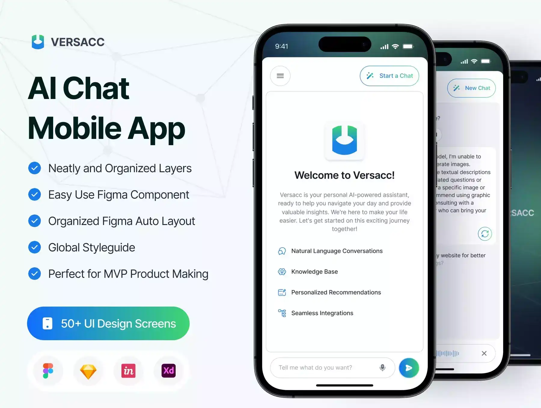 Versacc - AI Chat Mobile App UI KIT. We designed a highly detailed apps screen and certainly clean, so you can use it in your project