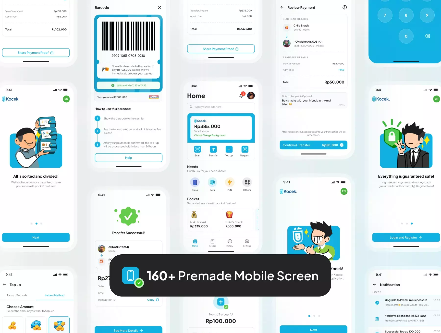 Introducing Kocek, a comprehensive UI Kit with over 160+ stylish mobile screens. It offers advanced features such as seamless Top-up, fast Peer-to-peer transfers, easy Interbank transfers, secure E-wallet transactions, customizable Pockets, and an innovative Money Splitter feature for effortless expense splitting. Kocek is your go-to for a next-level digital financial experience.