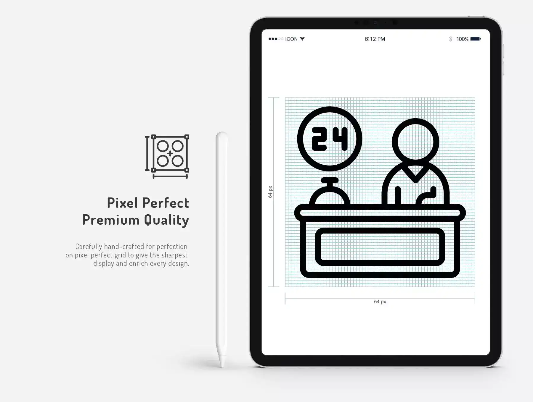 In this pack includes icons of 24-hour reception, A fitness center, Air conditioning, All-inclusive, Allowed with pets, Balcony, Beach first line, Beautiful Bathroom, Booking without card, Braille hints, Breakfast included, Bungalow, Capsule hotel, Coffee and tea, Cot, Disabled lift, Double bed, Electric kettle, Electric vehicle charging station, Fireplace, Flat screen TV, Free cancellation, Gym, Hair dryer, Help button in the bathroom, High toilet, Hotel, Jacuzzi, Kitchen Set, Low sink, Parking, Patio, Pool, Restaurant, Room service, Shoulders, Soundproofing, Spa, Tactile marks, Terrace, Three meals a day, Toilet with grab rails, Transfer, Two separate beds, View from the window, Villa, Washer, Wi-Fi , Without prepayment, Your house.