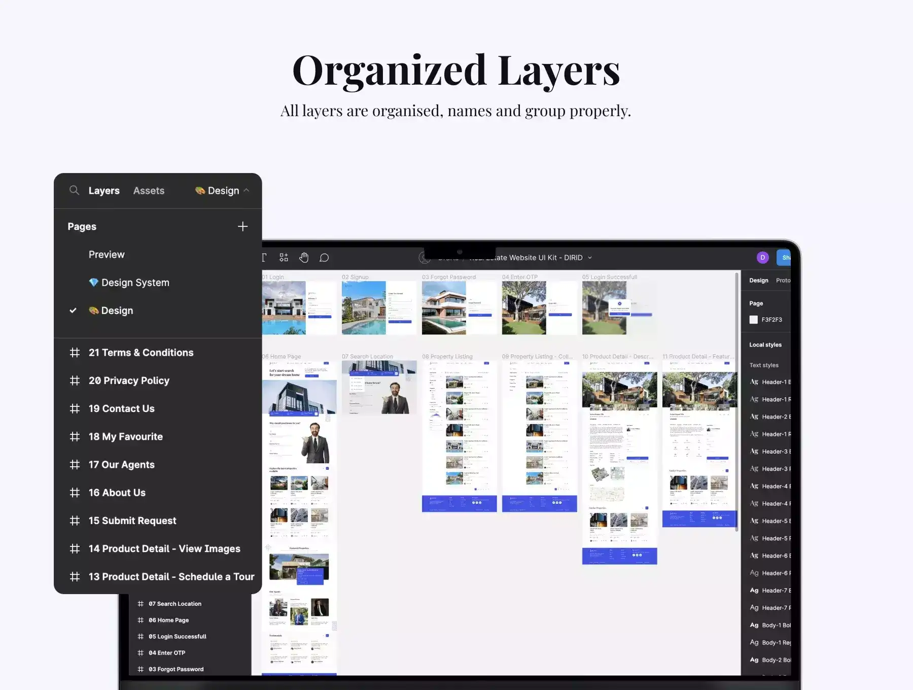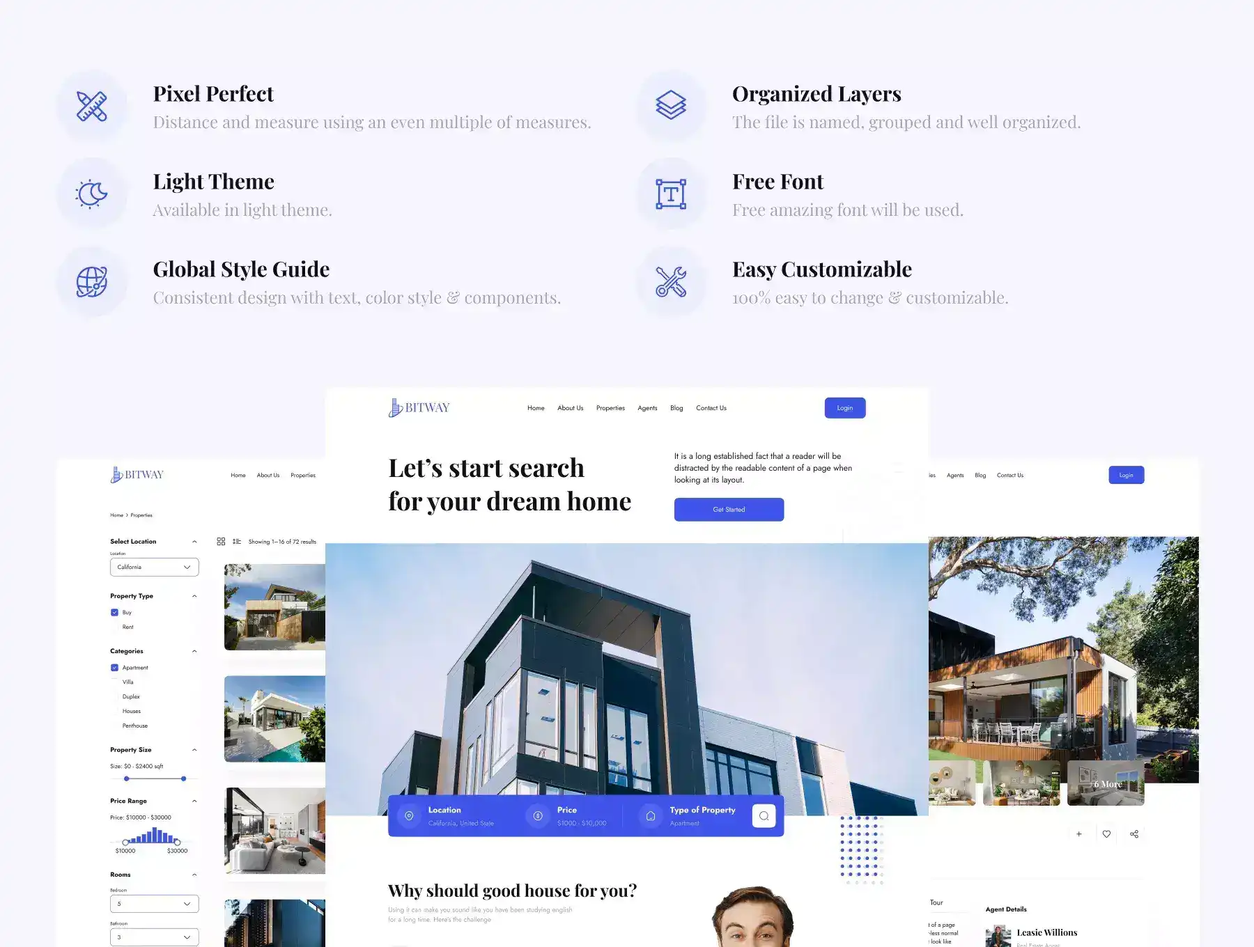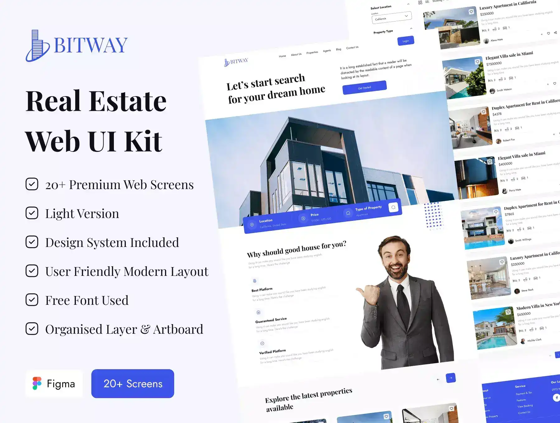 Introducing our Real Estate Web UI Kit, a comprehensive set of over 20+ pixel-perfect screens designed for easy use in Figma. With this kit, you can easily customize the design to your liking, taking advantage of all of Figma's features such as global color, font styles, dynamic components, and variants. Additionally, the UI kit is available in both Light themes, providing flexibility to suit your specific needs.
