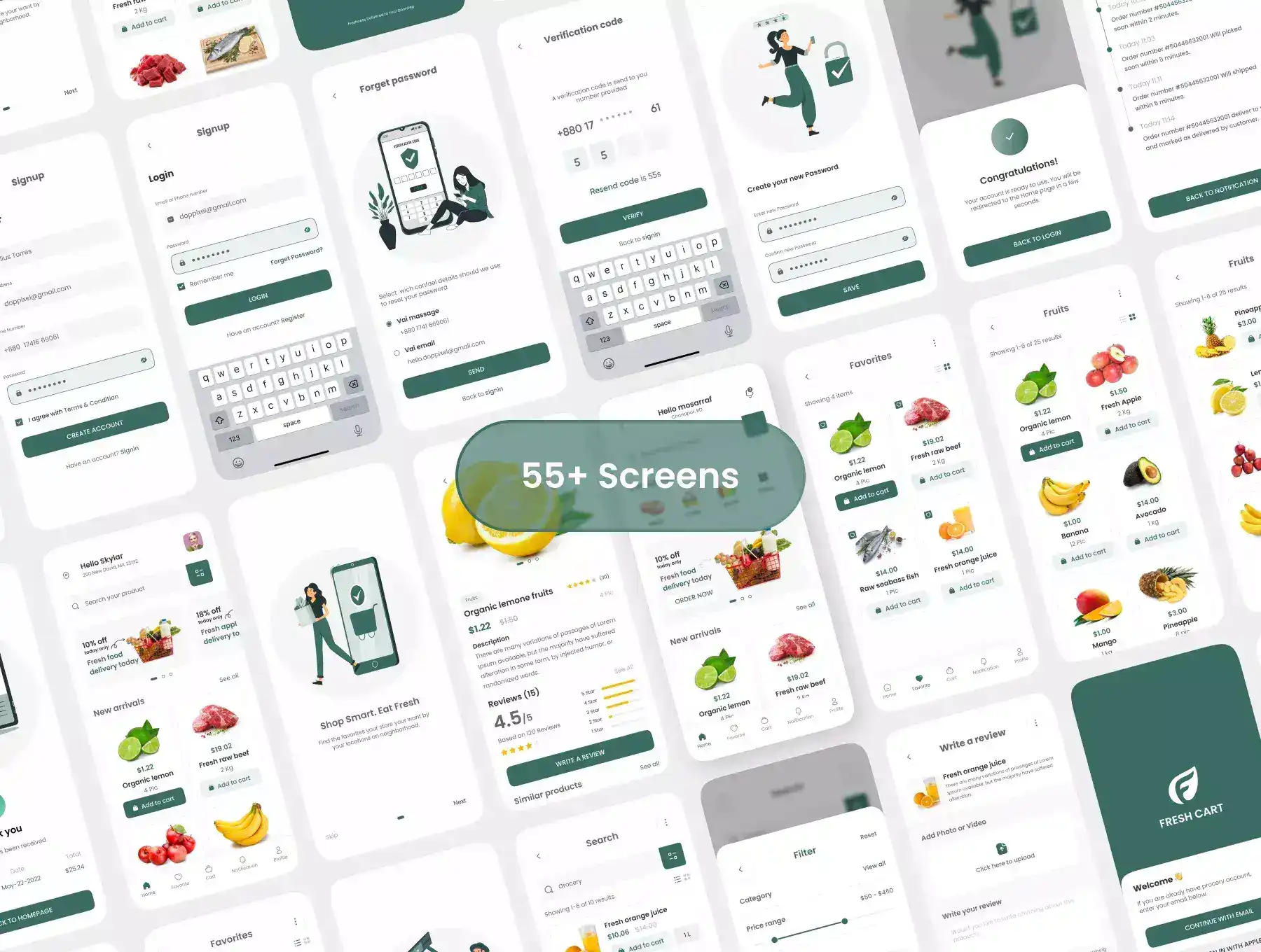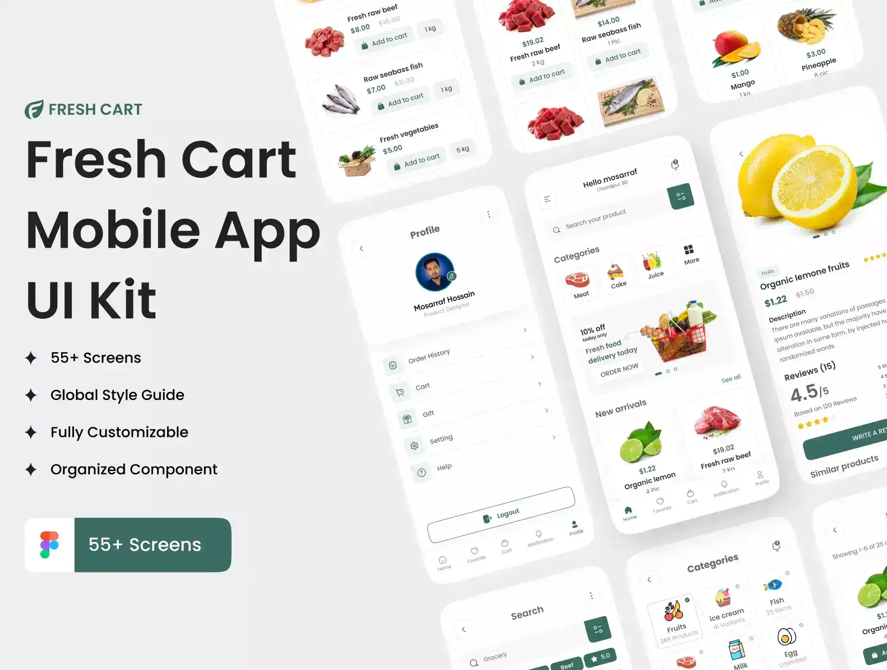 Fresh Cart - Grocery App UI Kit consisting of 55+ pixel-perfect screens and easy to use. The kit is easy to fully customize and leverages all features, including global color, font styles, dynamic components & variants. Fresh Cart is excellent for any person Food orders & Sepecealy Delivery Within 15 minutes. We create versions for not only sketch file but also Figma file, so it’s really easy to editable. Easy to use and screens are ready to use for iOS & Android app. You can easily change any design. It’s easy to customize and also well documented.