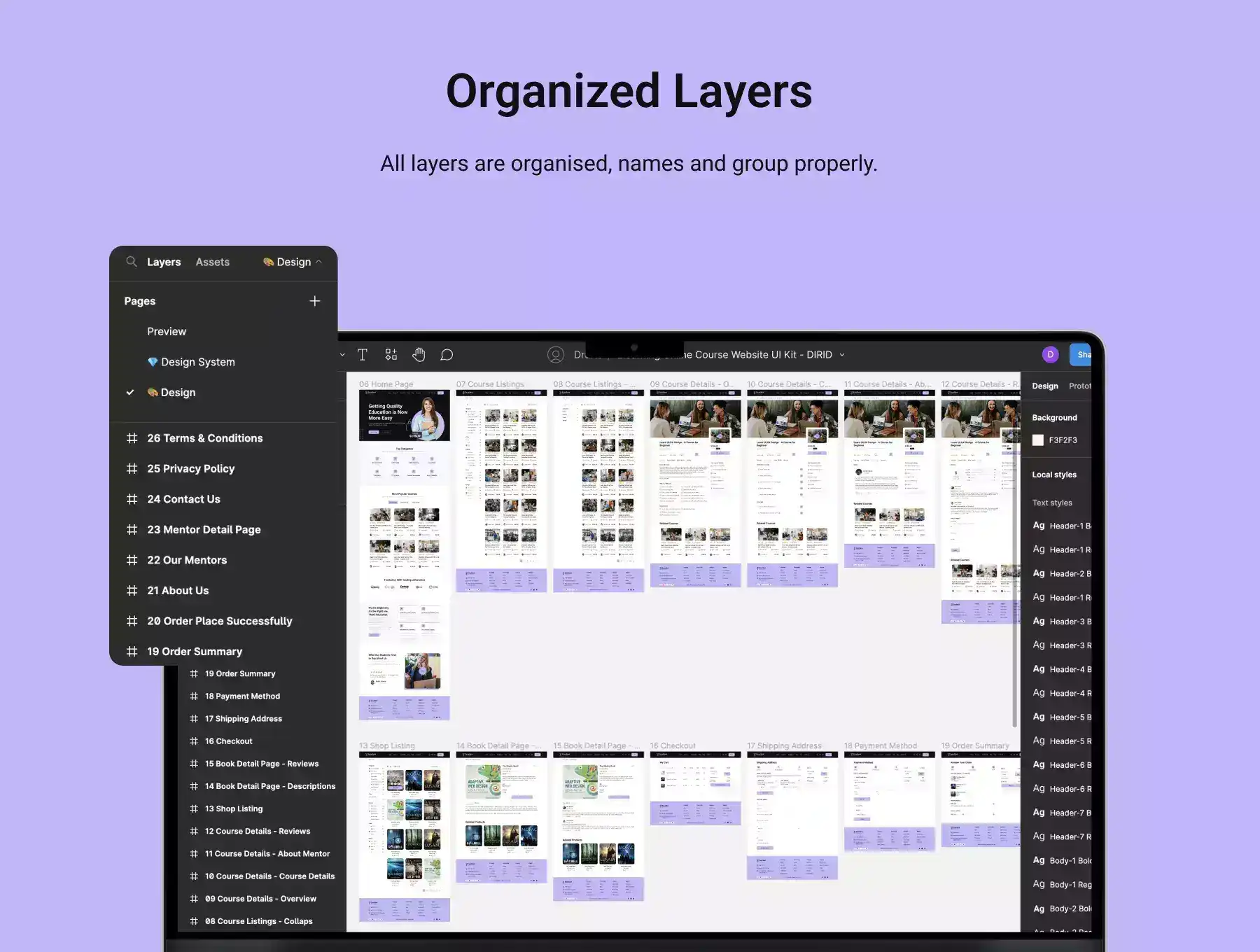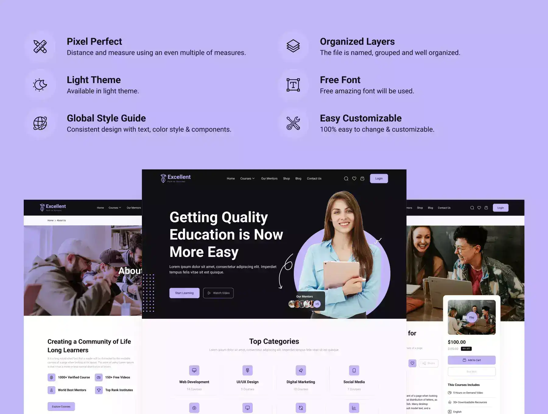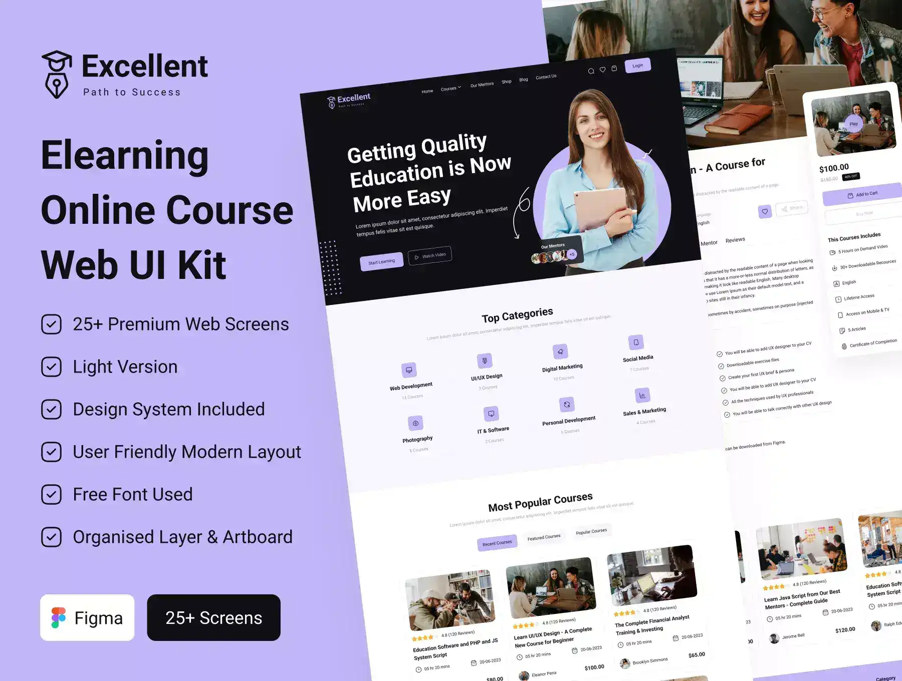 Introducing our Elearning Online Course Web UI Kit, a comprehensive set of over 25+ pixel-perfect screens designed for easy use in Figma. With this kit, you can easily customize the design to your liking, taking advantage of all of Figma's features such as global color, font styles, dynamic components, and variants. Additionally, the UI kit is available in both Light themes, providing flexibility to suit your specific needs.
