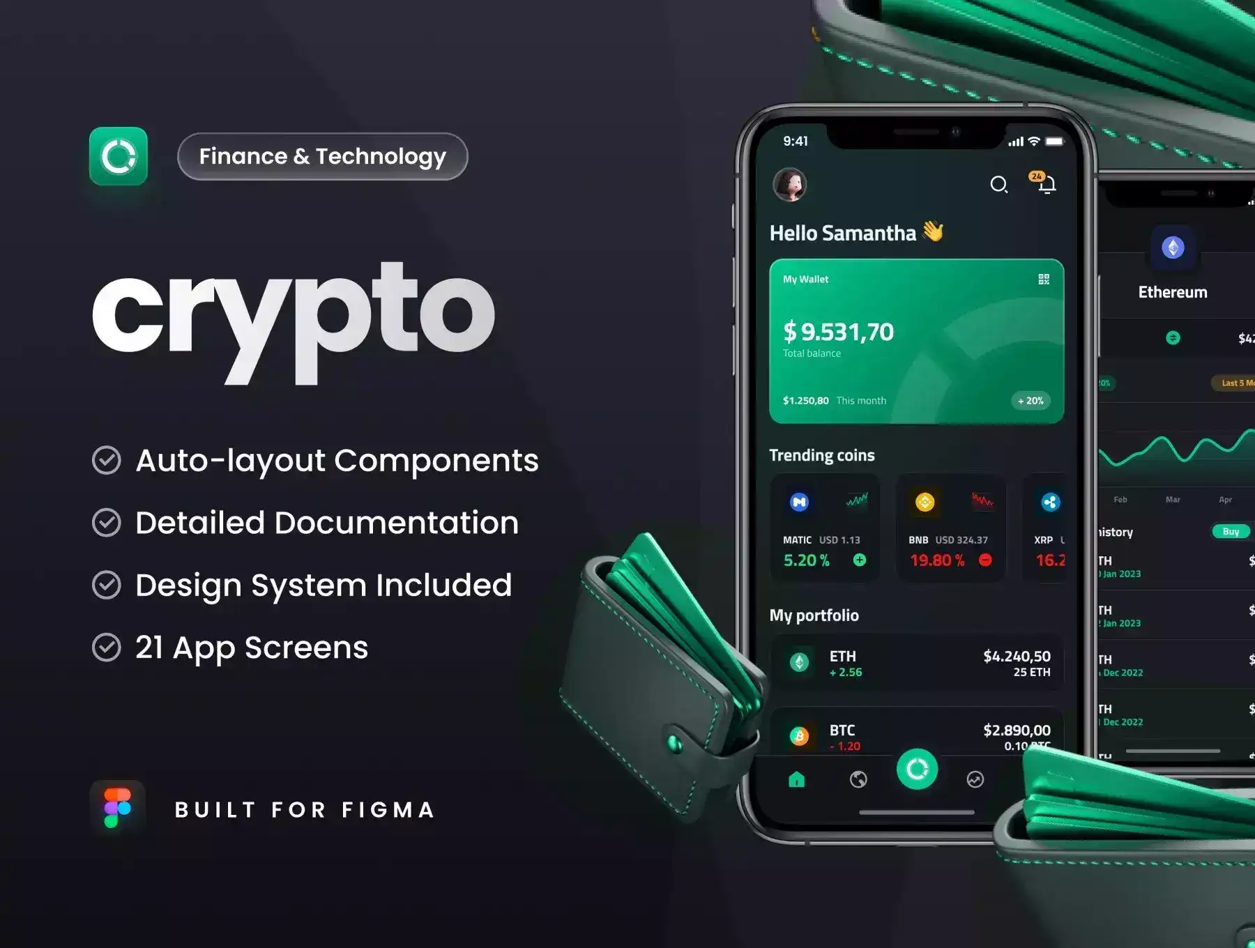 Crypto is a cryptocurrency wallet app UI Kit with clean, minimalistic, and modern design containing 21 high-quality screens which are fully compatible with Figma.