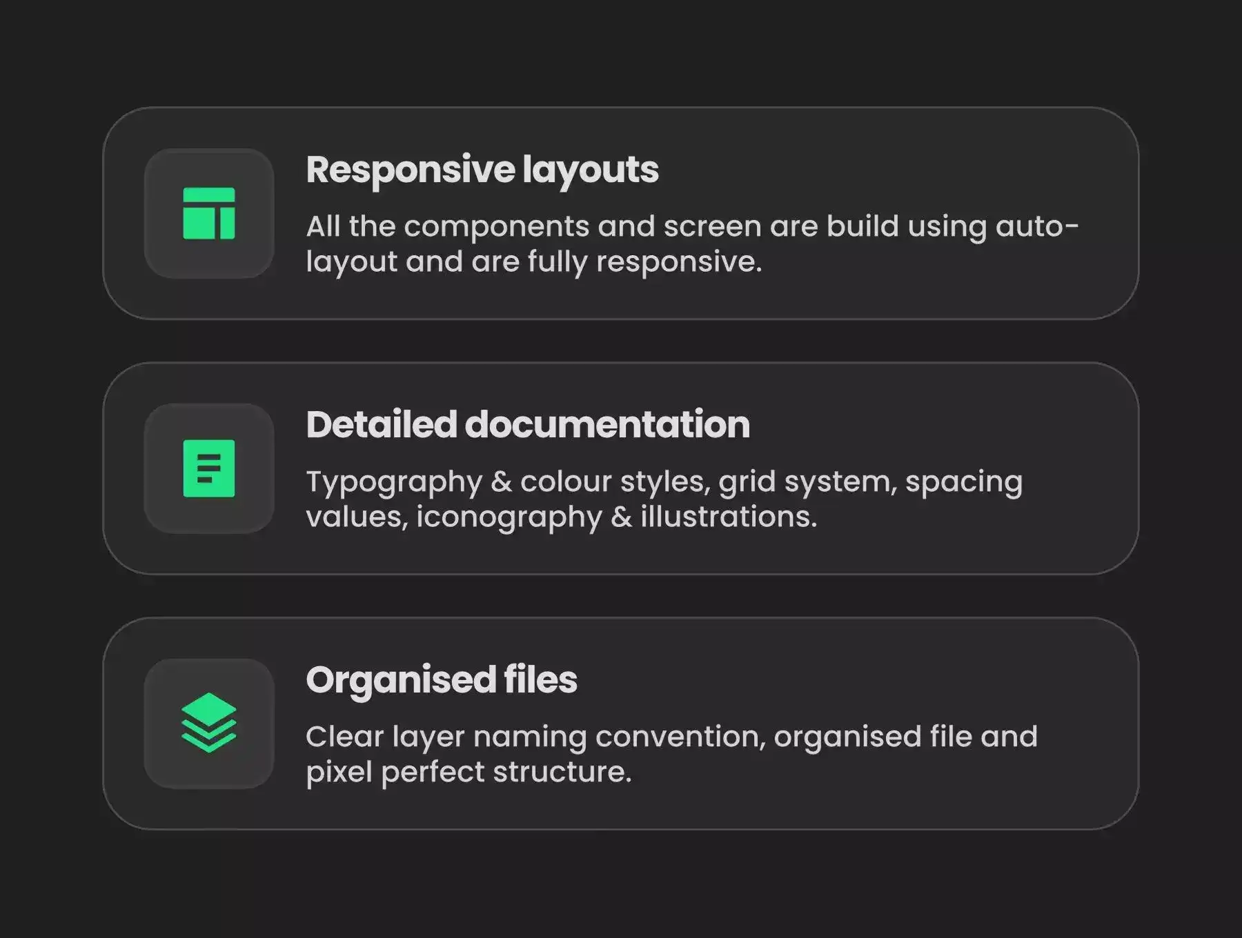 This UI Kit is build fully using Figma auto-layout feature making the designs fully responsive for any mobile device and using global styles and systems which include Typography, Colours, Grid, Spacings, Iconography and Illustrations.