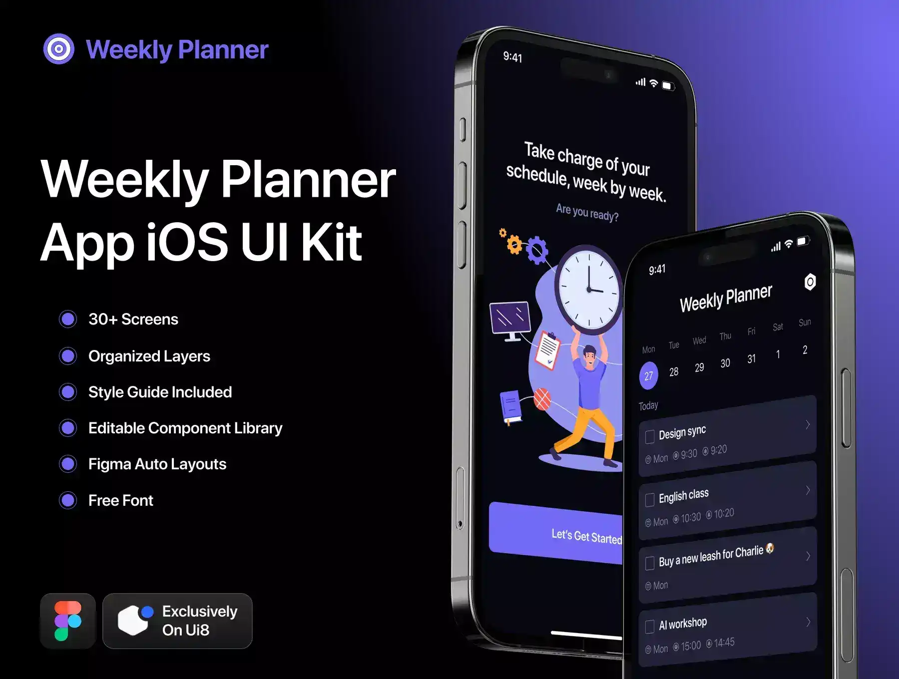Discover the Weekly Planner iOS UI Kit for Figma, a thoughtfully designed resource to boost productivity and streamline the organization. This all-inclusive UI kit is meticulously created for iOS app creators and designers, ensuring a flawless user experience when scheduling tasks and managing your weekly agenda.