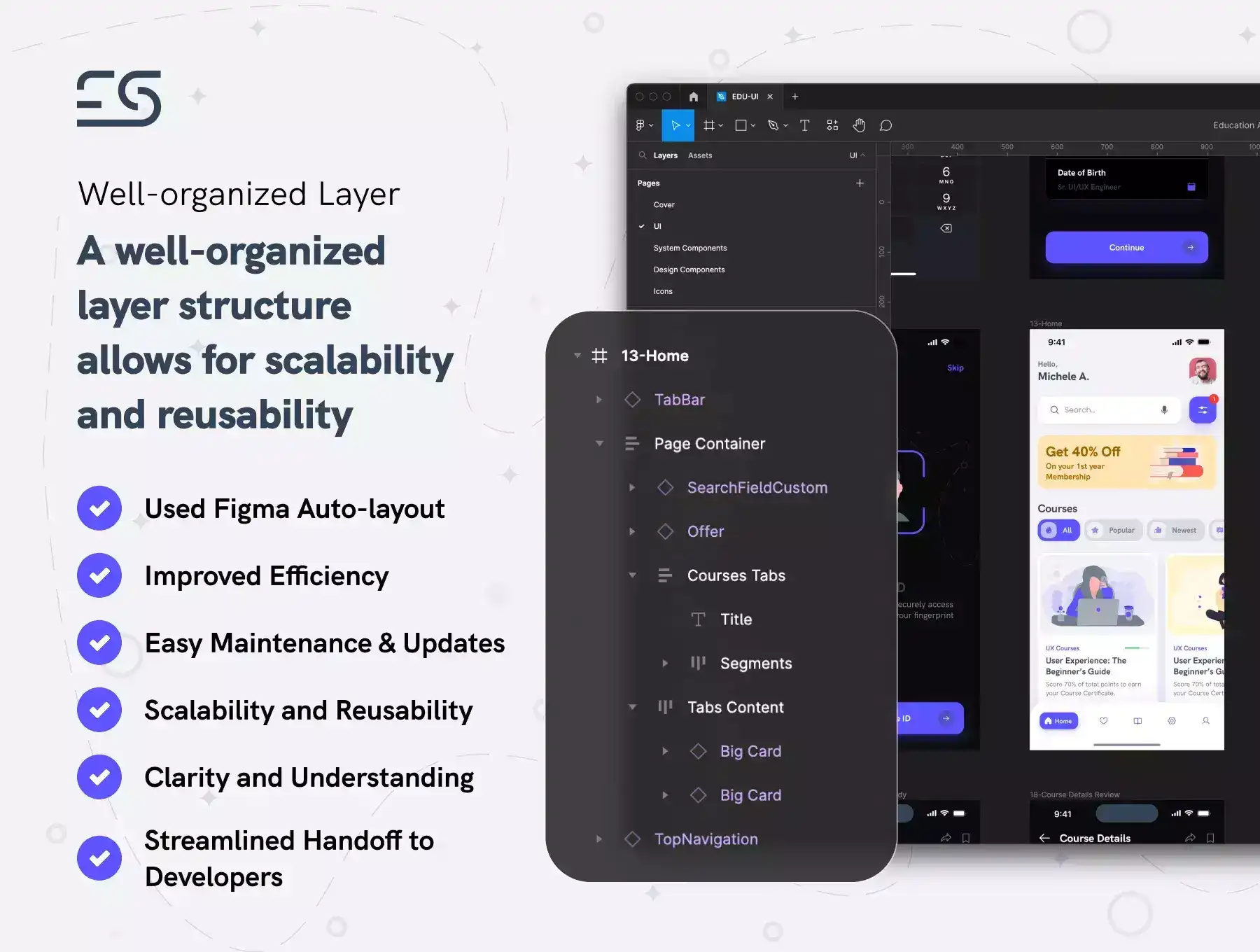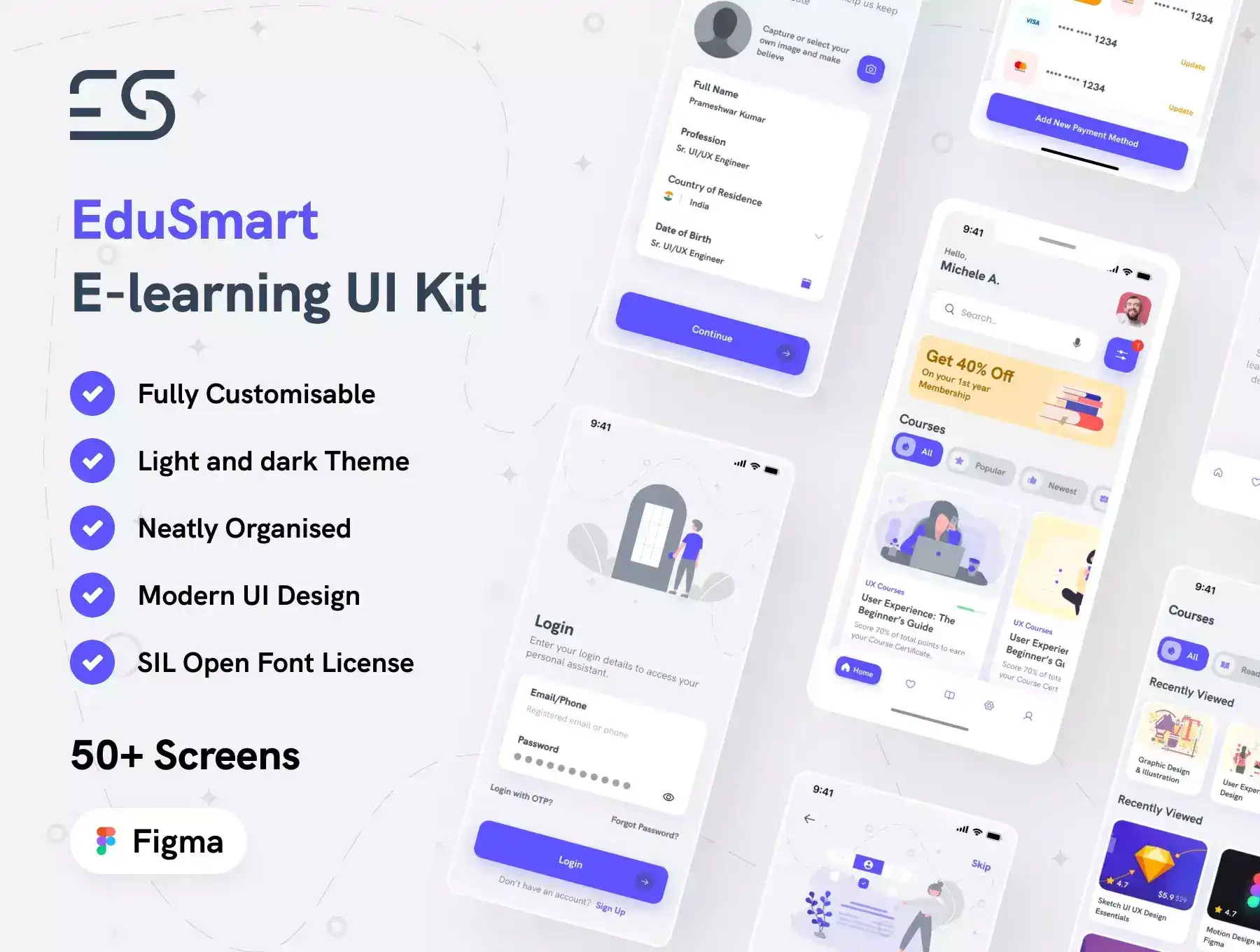 EduSmart E-learning UI Kit 50+*2 Screens with Light and Dark Theme. Highly customisable Mobile App screens in Figma file, useful UI Elements. Each screen is fully customisable, well-named layers and handcrafted in Figma, Used new feature of Figma which help to maintain consistency for any customisation.