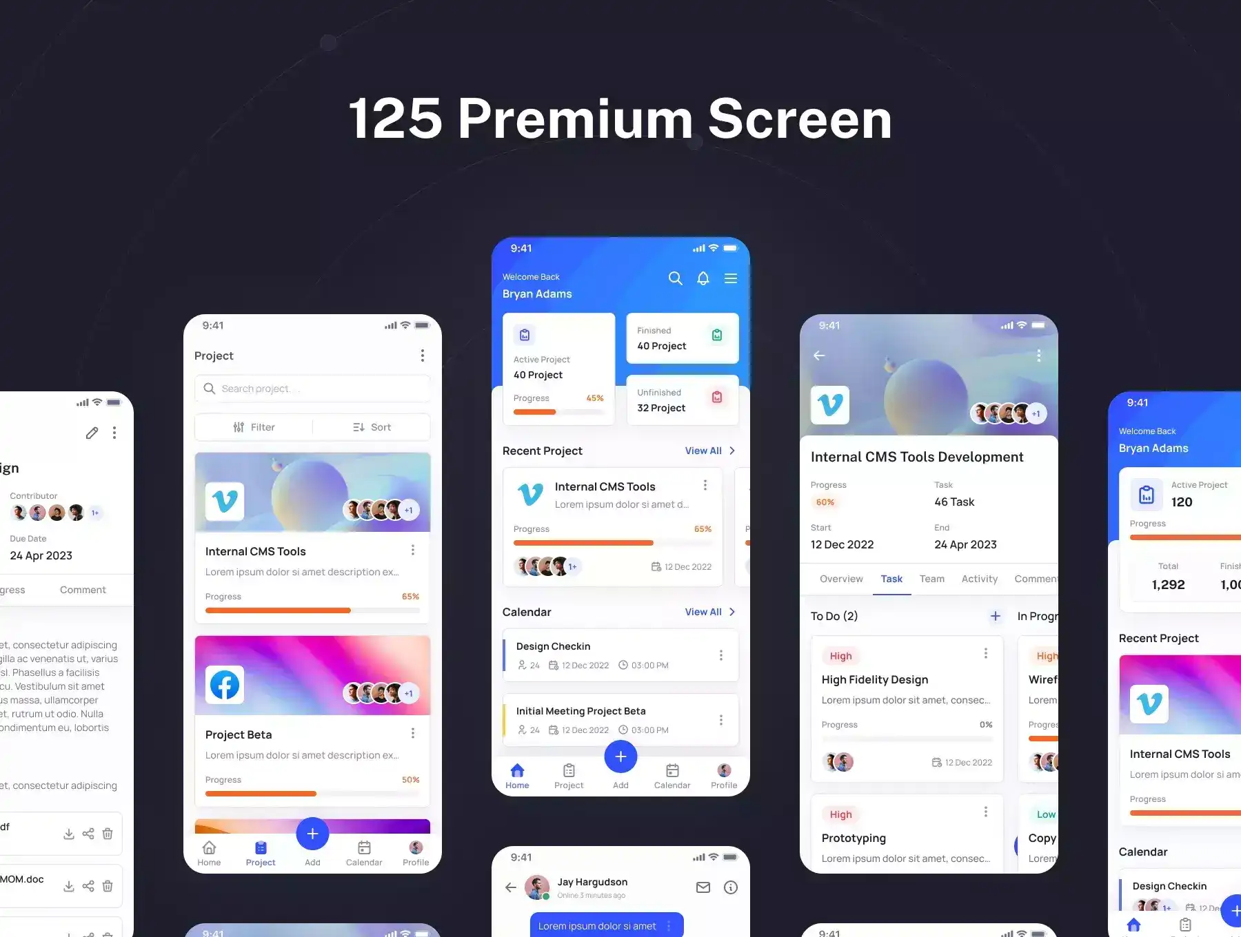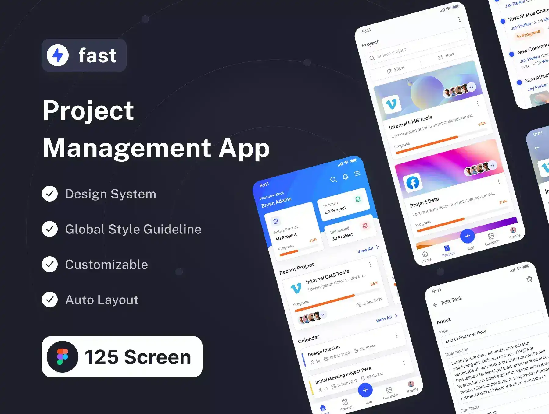 Fast Project Management App is a UI Kit for project management and task management with 125 high-quality screens. This UI Kit also contains calendar, messages, team management, and file management so you can manage everything in one place.