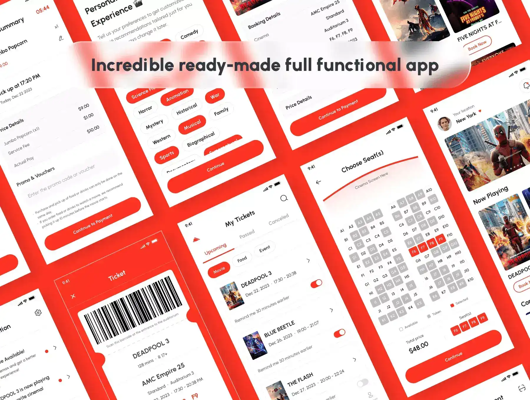 Cinemax is a Premium & High Quality UI Kit with Full Functional of Movie Ticket Booking Mobile App. You can see various cinemas, book movie tickets, manage tickets, order food for the cinema, and many other features.