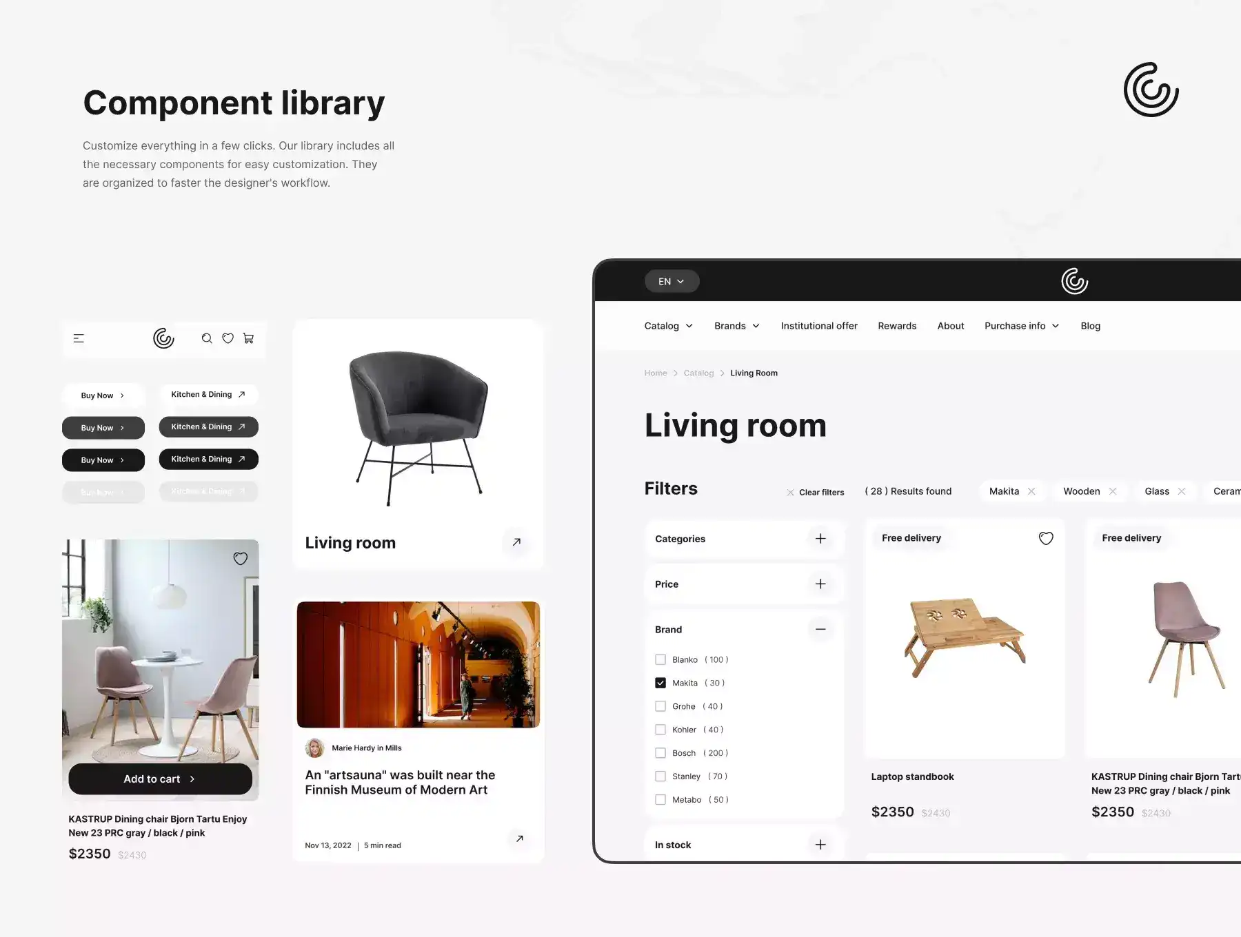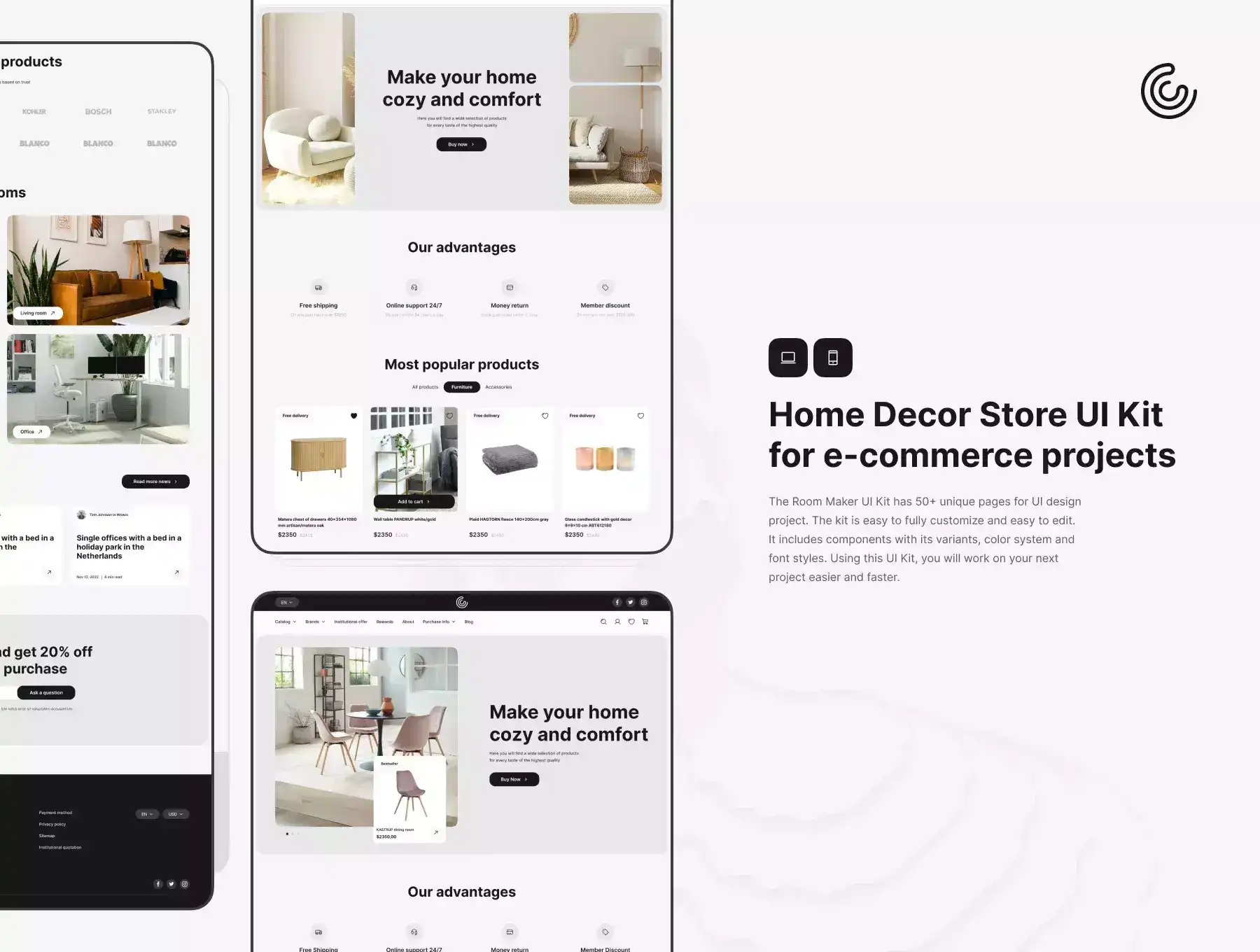 Home Decor Store UI Kit has 25+ unique pages for a UI design project. The kit is easy to customize and easy to edit fully. It includes components with variants, color system and font styles. Using this UI Kit, you will work on your next project easier and faster.