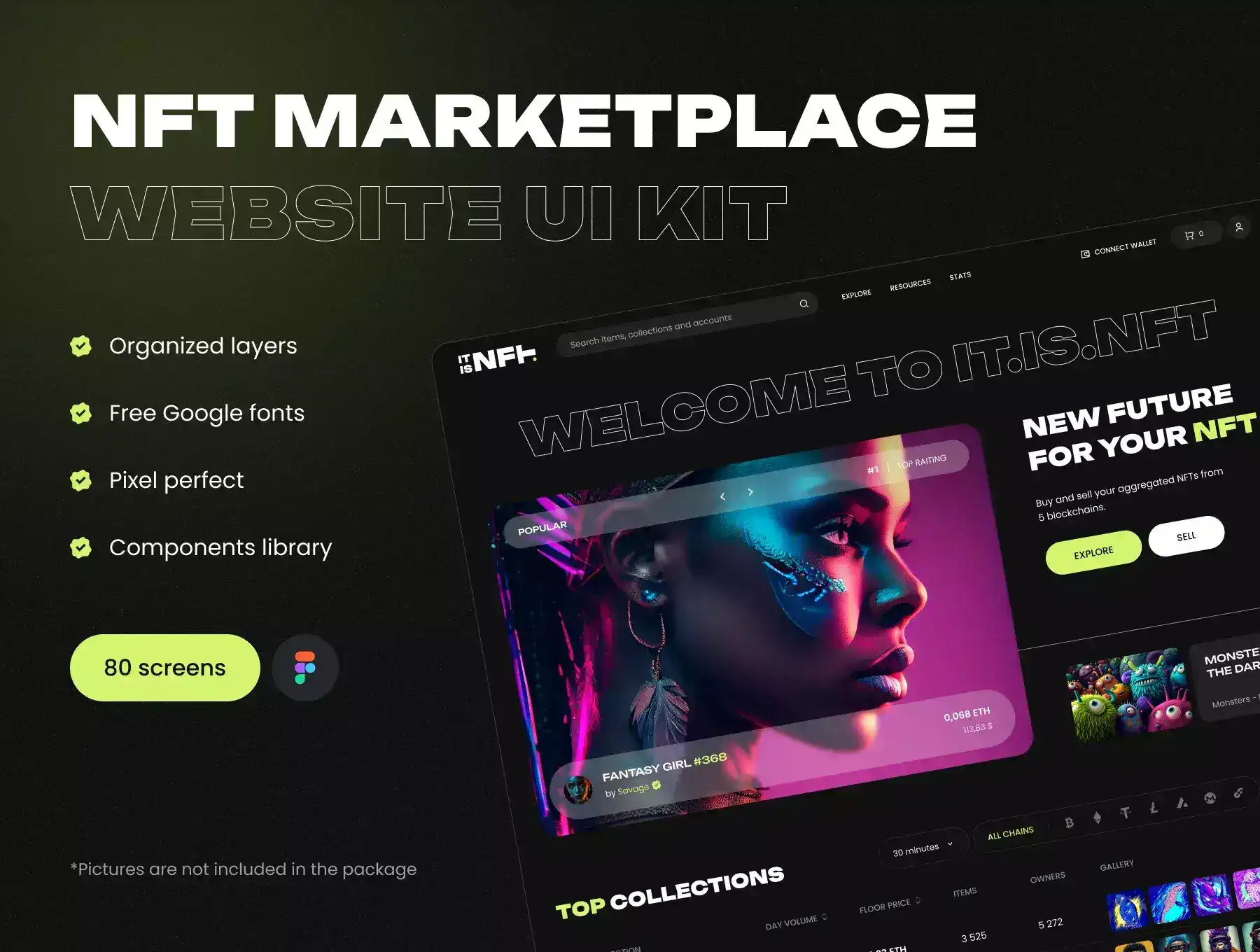 NFT marketplace UI Kit with 80 high-quality screens and is easy to use with a clean, neat, and modern design. Available in Figma file.