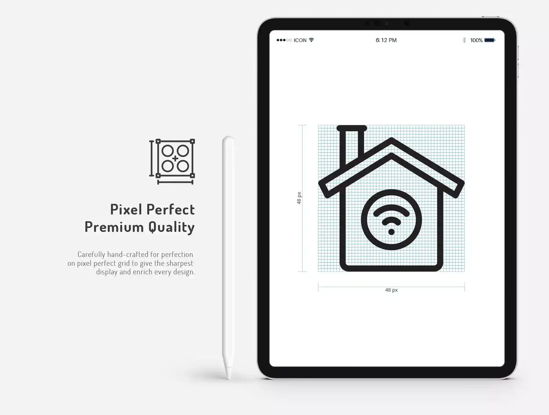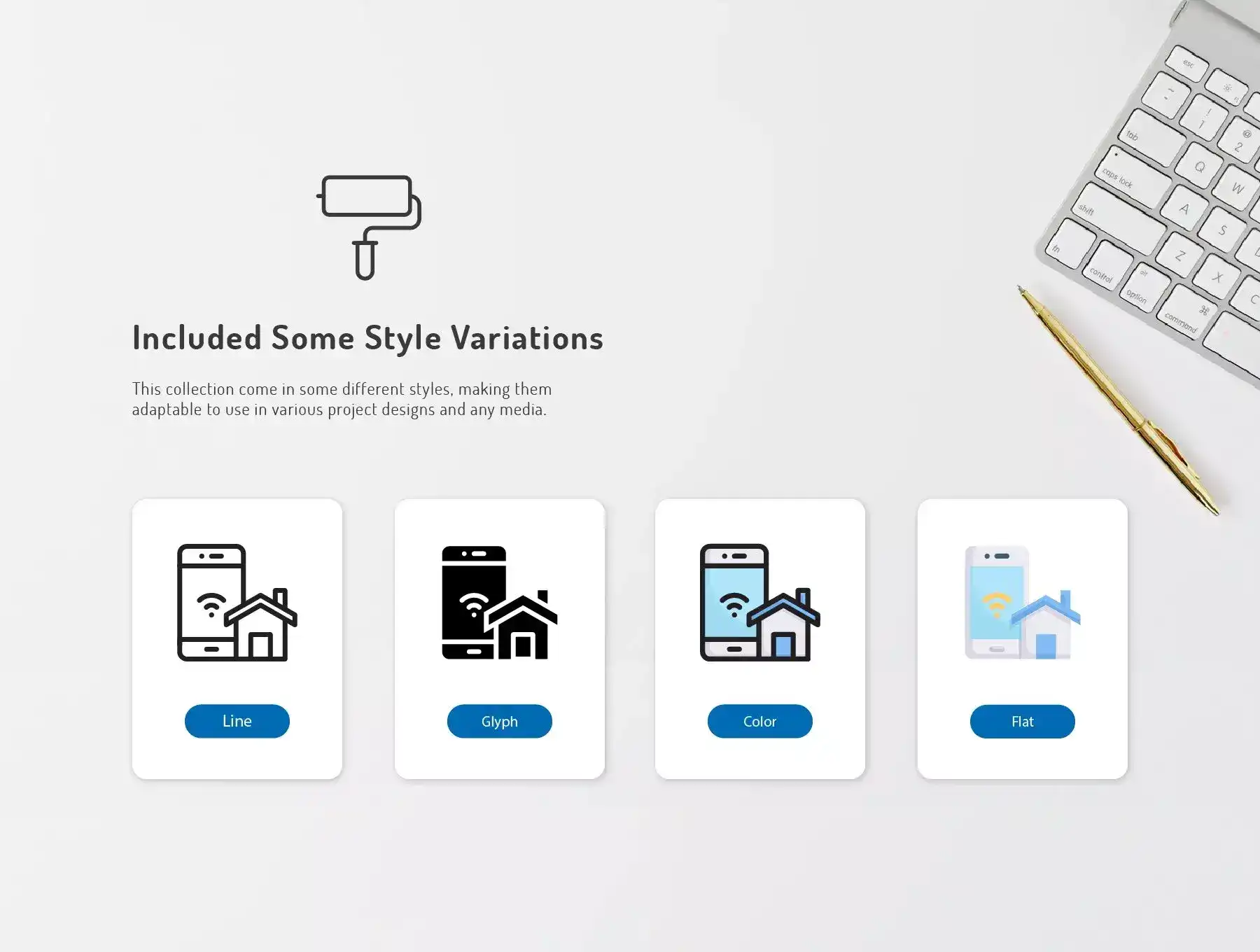 In this pack includes icons of Air Conditioner, Alexa Speaker, Big refrigerator two-door, CCTV, Coffee machine, Curtain, Dishwasher, Face scanner, Fan, Faucet, Fire alarm bell, Garage, Garbage, Google speaker, Home and CCTV, Home and WI-FI, Home and wiring, Home protect, Illumination, Intercom with camera, Key card, Low battery, Password safe, Plant, Plug, Protect shield, Refrigerator, Remote, Robot vacuum, Router, Save Water, Slow cooker, Smart home control system, Smart home setting panel, Smart lock on door, Smart temperature, Smart TV, Smartphone and bulb, Smartphone and home, Smartphone galaxy fold, Smoke detector, Socket USA, Solar panel, Stove, Teapot, Toilet, Touch Screen, Washing machine, Water dispenser, Wireless charge.