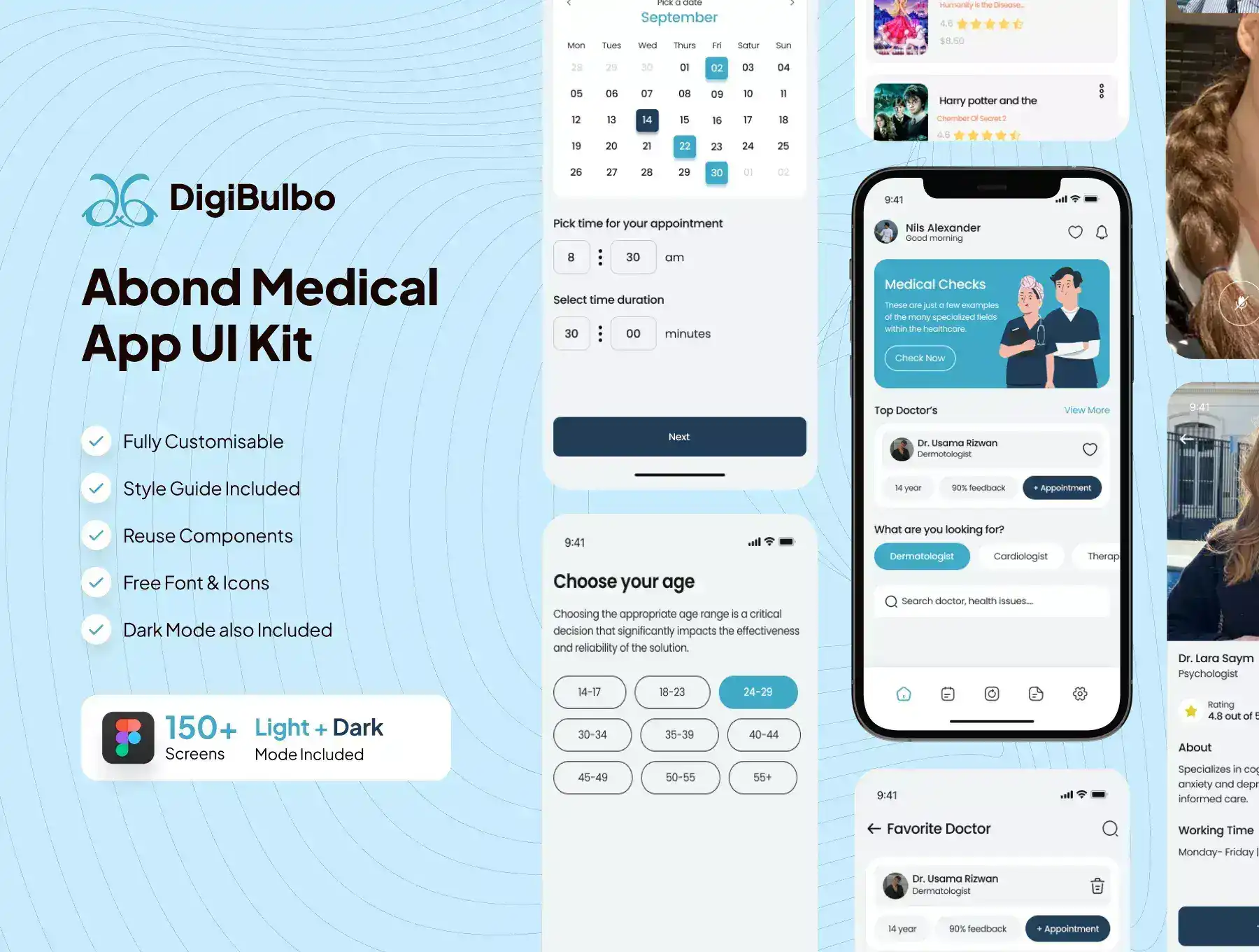 Introducing the Abond Medical App UI Kit – an exceptional collection of meticulously crafted app UI elements that comprises over 150+ well-designed UI screens, components, and elements.