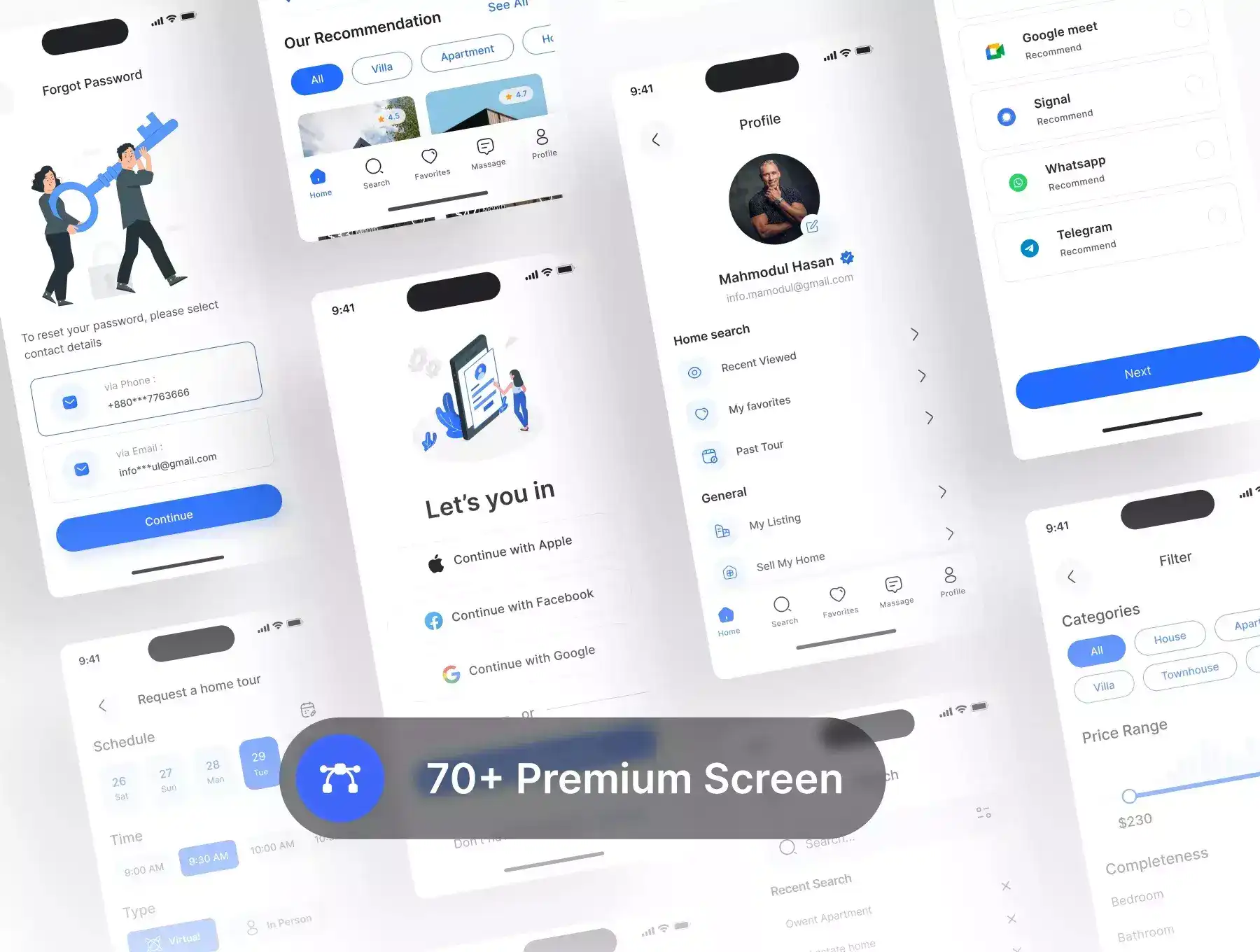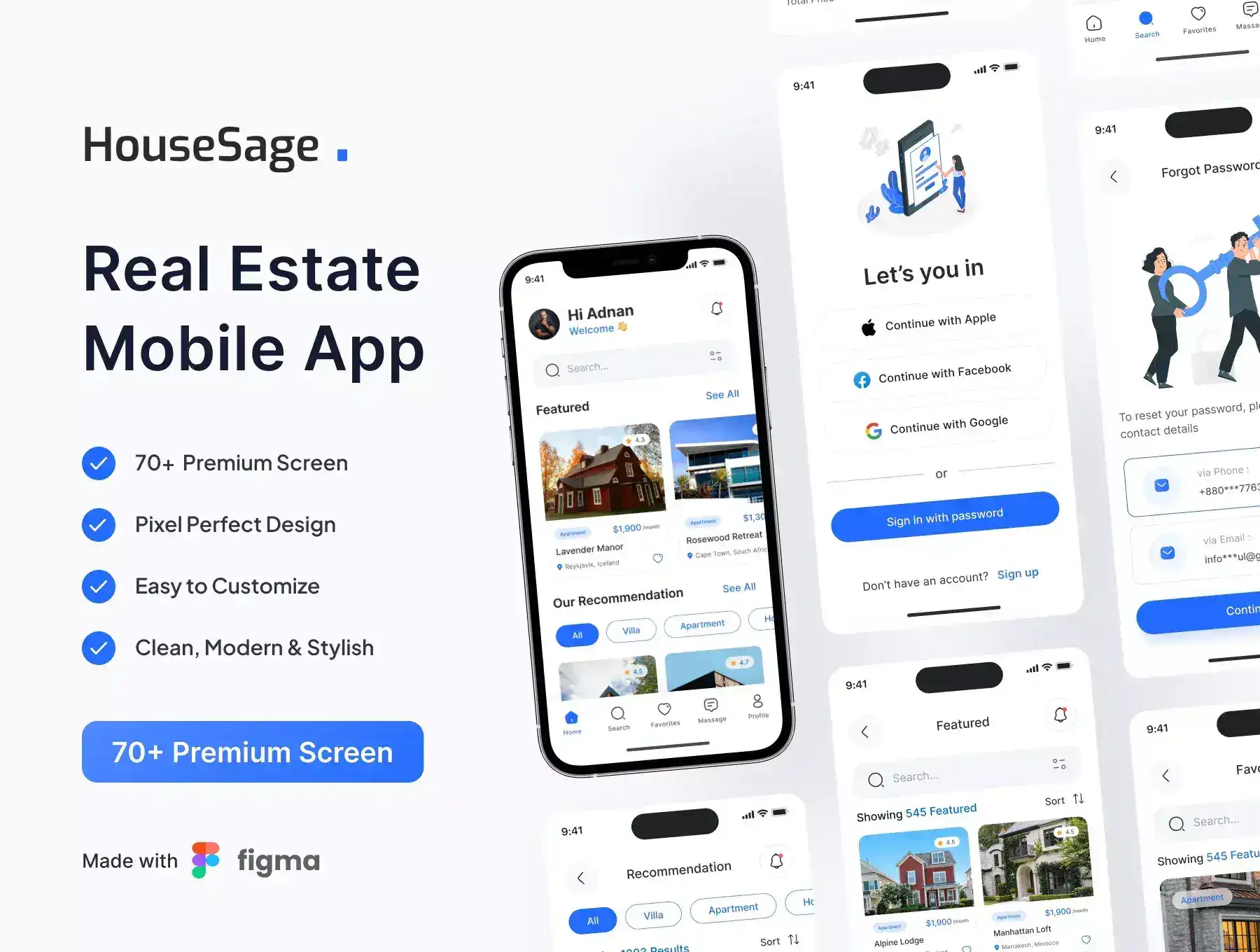 HouseSage - Real Estate Mobile App with Clean, Pixel Perfect design & Modern design. That comes with more than 70+ of Well-Designed UI screens, elements and components. Easy to use in Figma.
