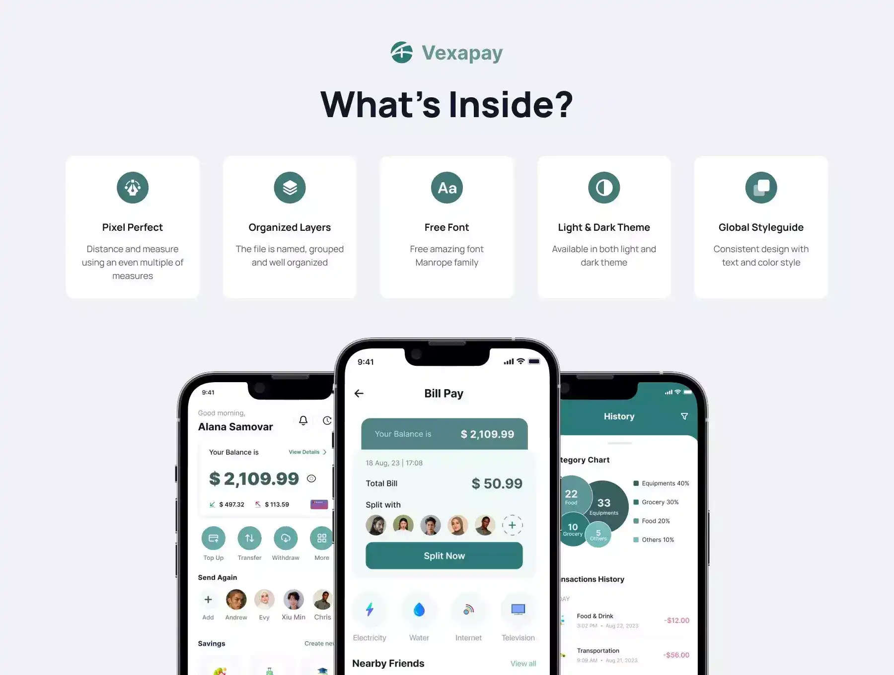 Vexapay is included to all Figma features, including global style guide, dynamic components, auto layout and variants.