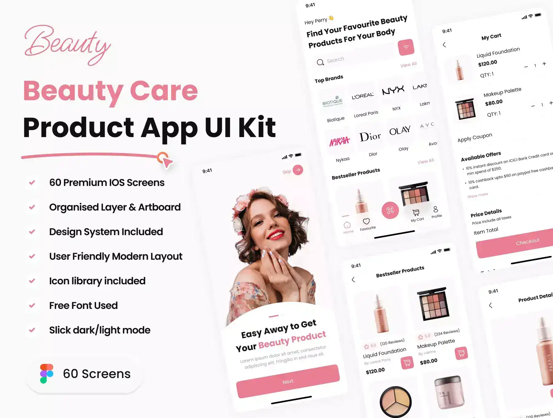 Introducing our Beauty Care Product App UI Kit, a comprehensive set of over 60 pixel-perfect screens designed for easy use in Figma. With this kit, you can easily customize the design to your liking, taking advantage of all of Figma's features such as global color, font styles, dynamic components, and variants. Additionally, the UI kit is available in both Light and Dark themes, providing flexibility to suit your specific needs.
