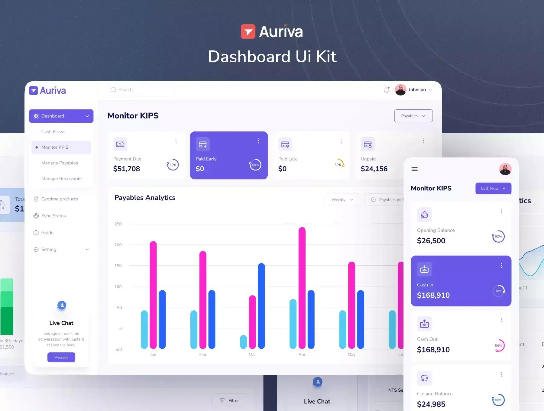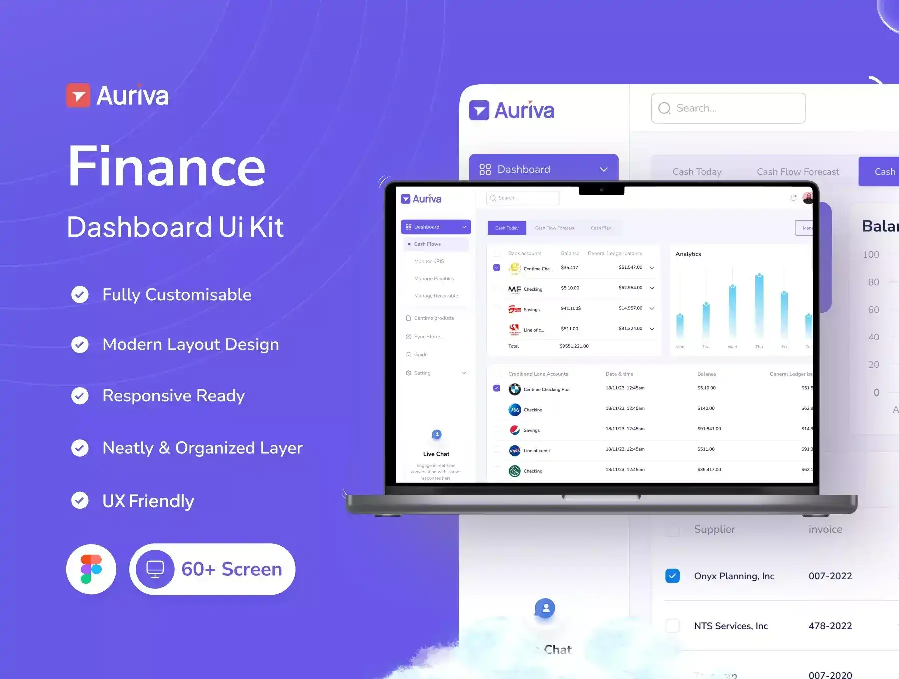 Auriva is a Premium and High-Quality Finance Dashboard UI Kit with 60+ high-quality screens and easy to use in Figma with Mobile Responsive Design.