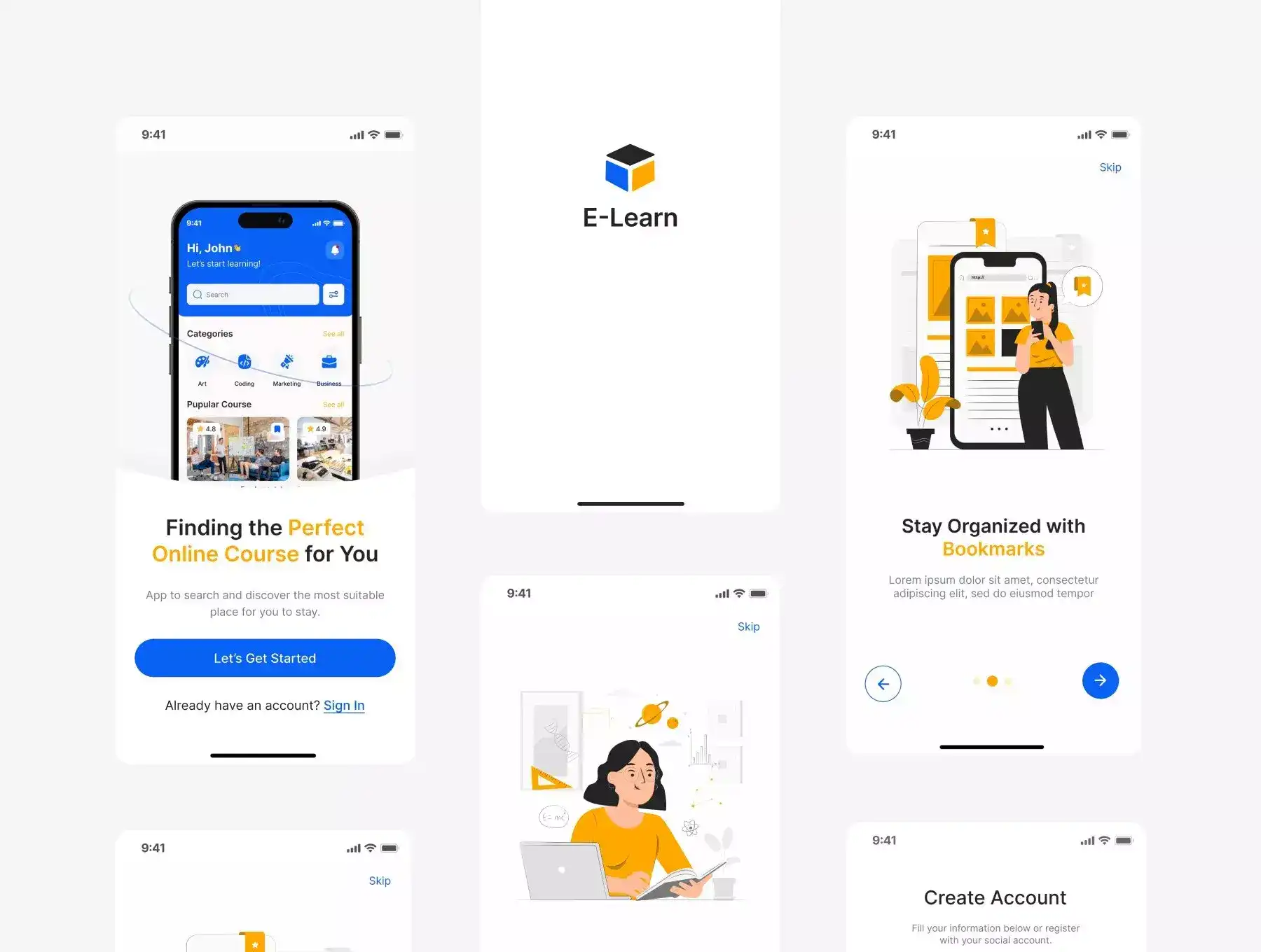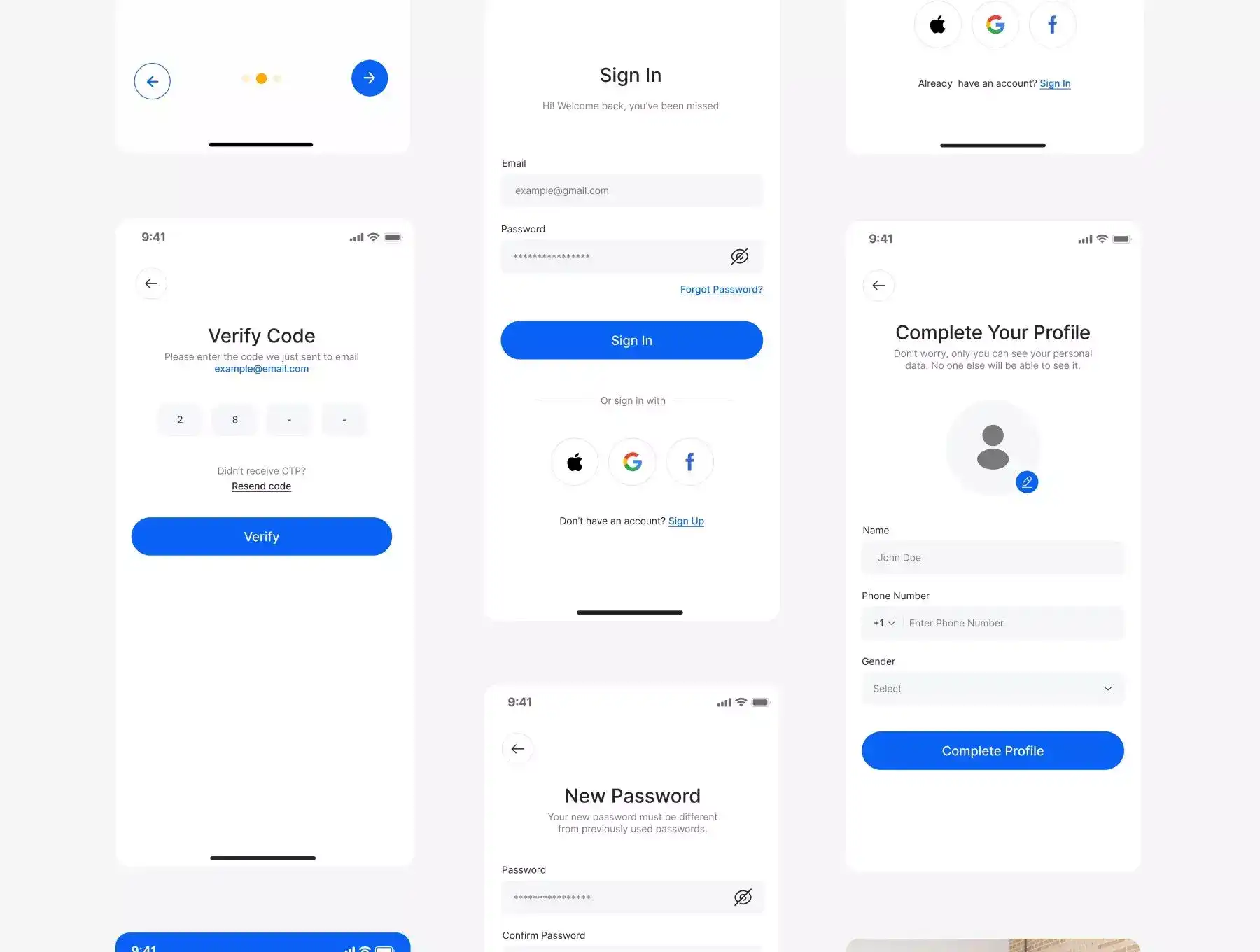 -Sign In, Create Account, Verify Code, New Password, Complete Your Profile