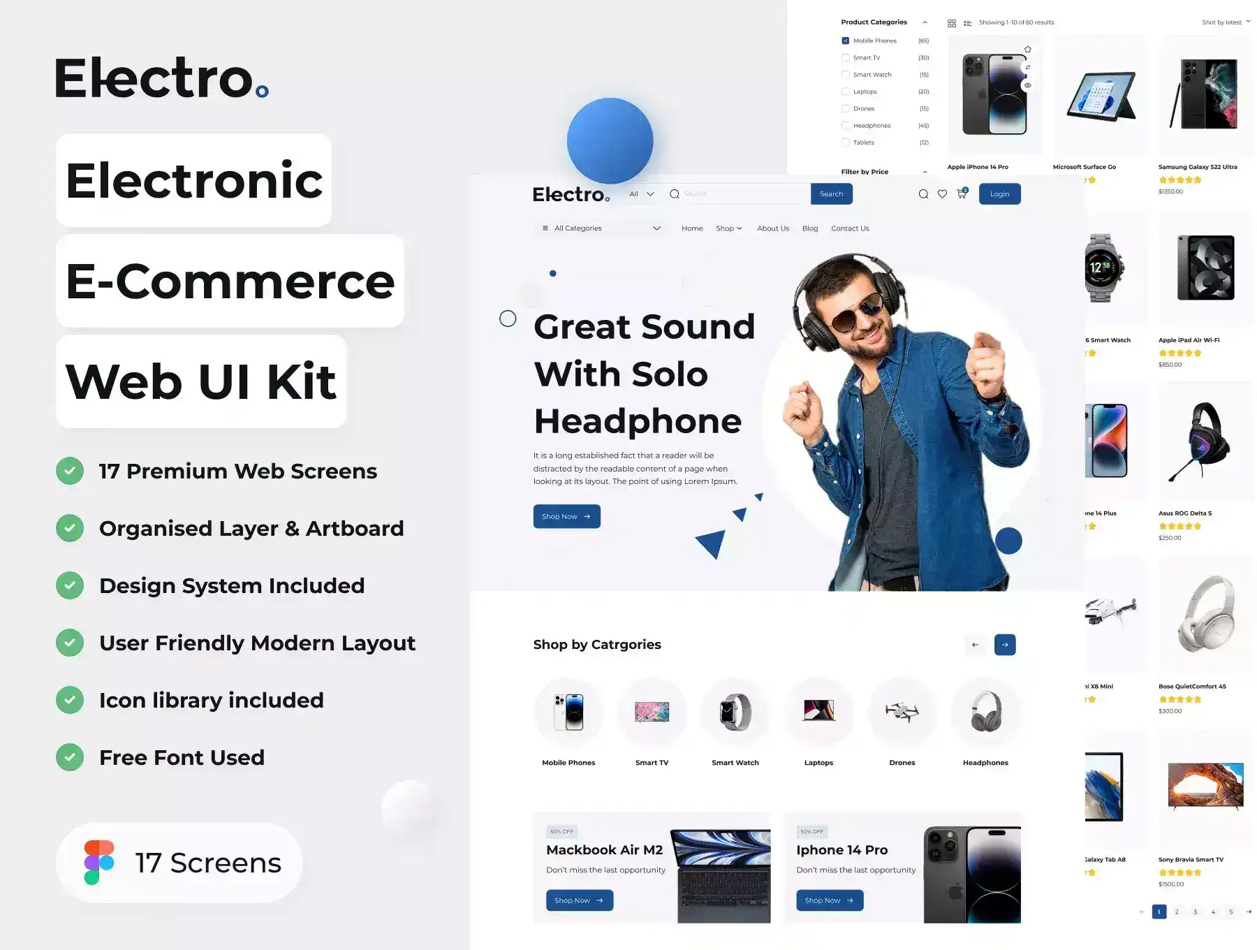 Introducing our Electronic E-Commerce Web UI Kit, an exceptional collection of over 17 meticulously crafted screens specifically tailored for the electronic ecommerce industry. This comprehensive kit is designed for effortless use in Figma, allowing you to effortlessly customize every aspect of the design. Leverage Figma's powerful features, including global color, font styles, dynamic components, and variants, to create a unique and captivating website.