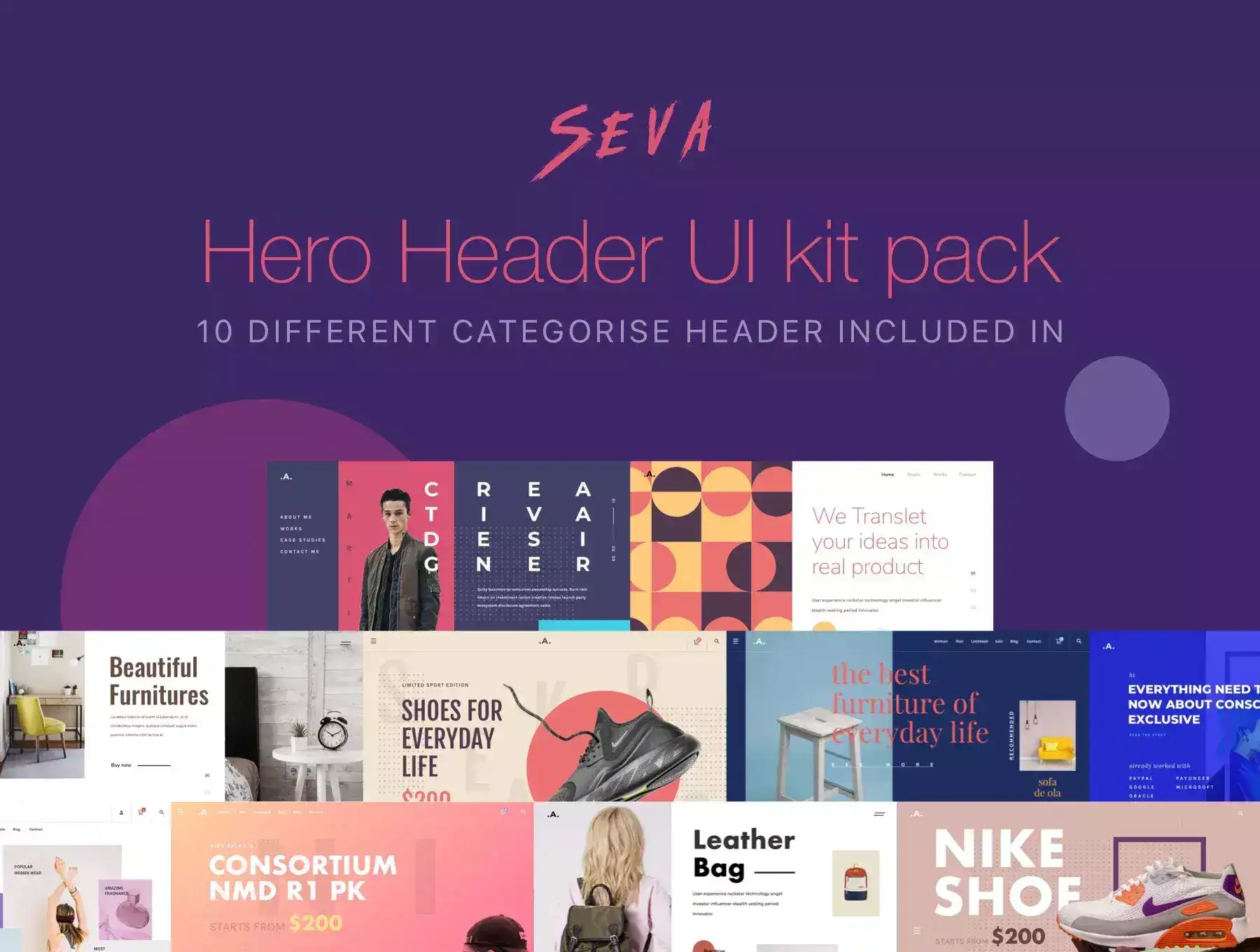 Seva header ui kit pack is a high quality pack of 10 web header pages which will accelerate and boost your design process and will help you develop an outstanding experience. This kit is created on such way so that all the components are fully customizable. All layers are grouped, named and organized.