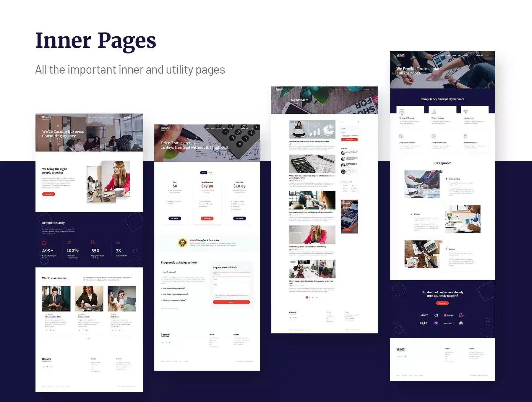 Casumi was designed with the intention to help small businesses to have an amazing and modern website in no time. Casumi is a clean modern HTML template for financial, consulting firms and small businesses. We carefully crafted all the important components and pages. With Casumi you’ll also get a premium 72 icons collection. How about new GDPR compliance? We also took care of it, cookies notification and consent checkboxes are included. Casumi built with BEM, Sass, modular JavaScript and clean well-commented HTML code. Loads faster, works great on mobile devices. Try Casumi for your next website.