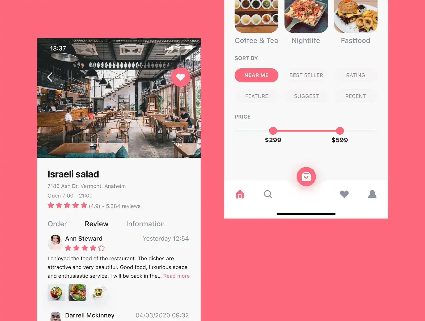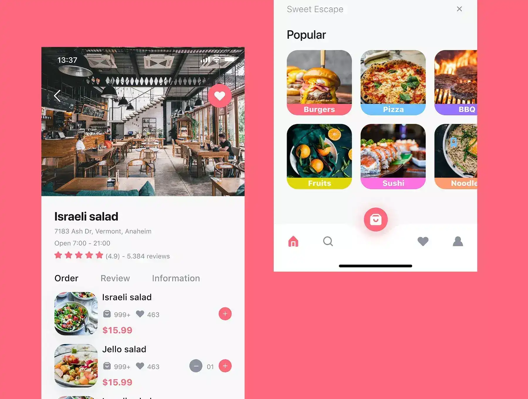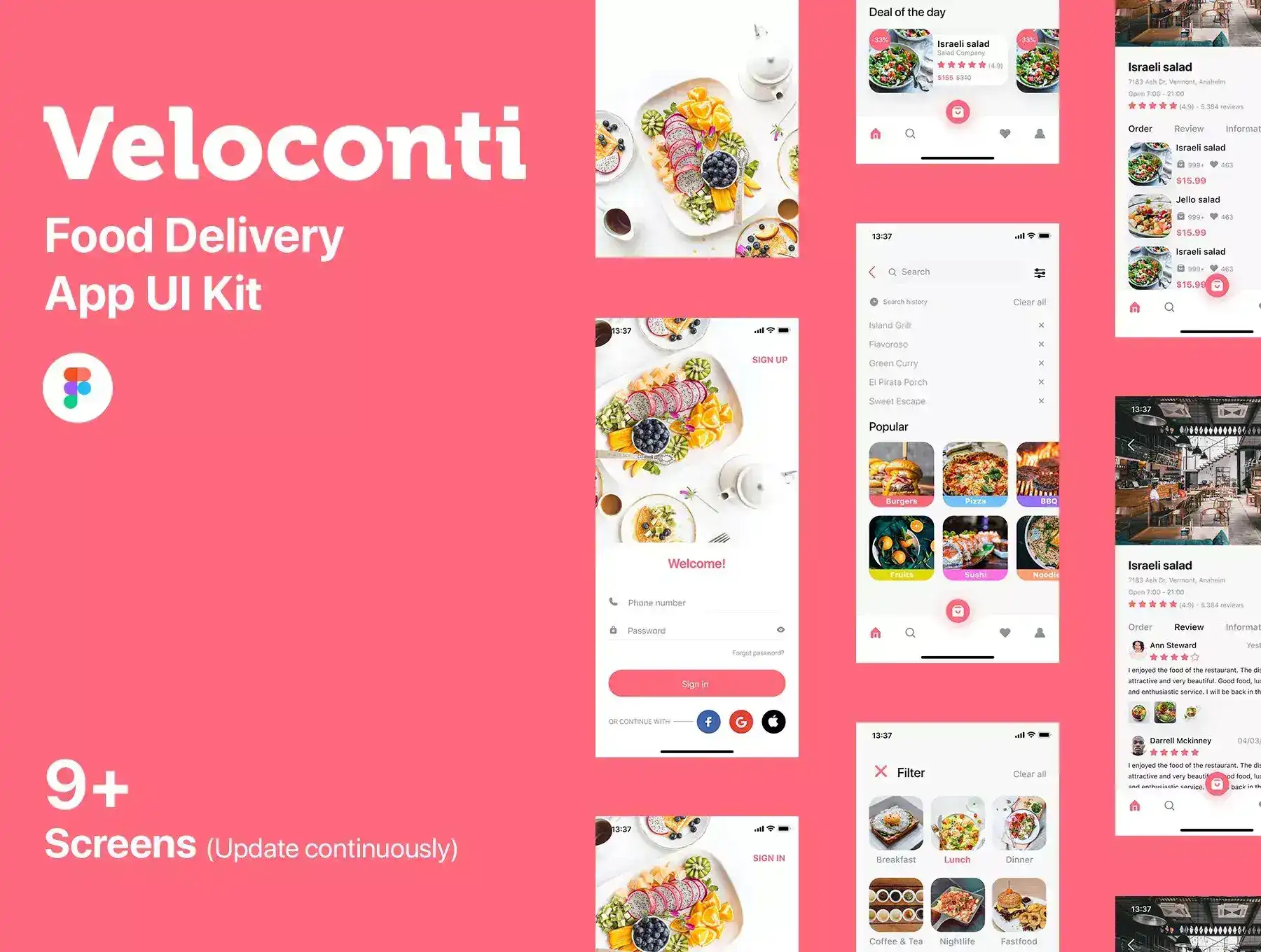 Veloconti - Food Delivery App. Figma file included. Each screen is fully customizable and well organized in symbols. It contains 9 screens (Update continuously)