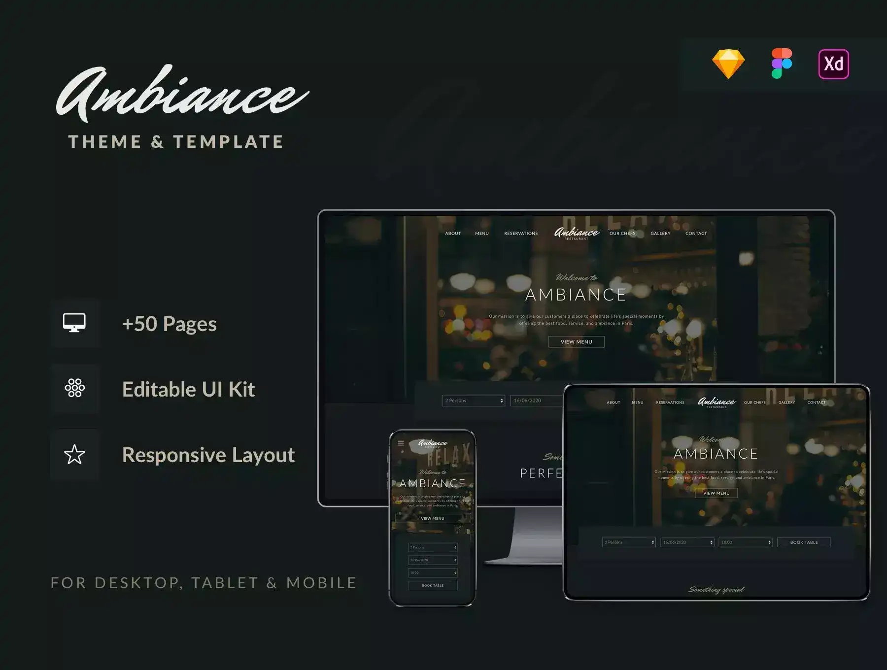 Ambiance Theme will help you and your customers to create an awesome experience and product. The theme was specially designed for restaurants, bars or cafes but it can be applied for different domains by using the pre-made sections. The file is optimised for a fast design process with editable UI kit, symbols for elements and components, and for easy development by using Font Awesome icons, Bootstrap layout for desktop, tablet and mobile sizes.