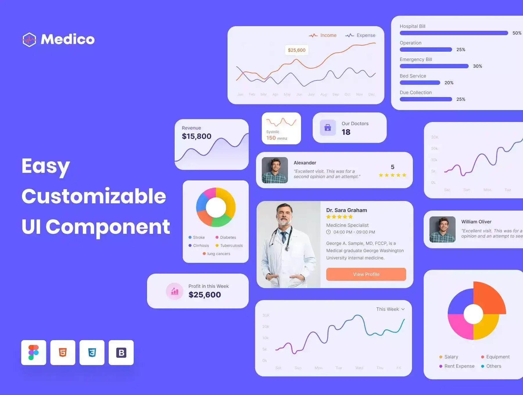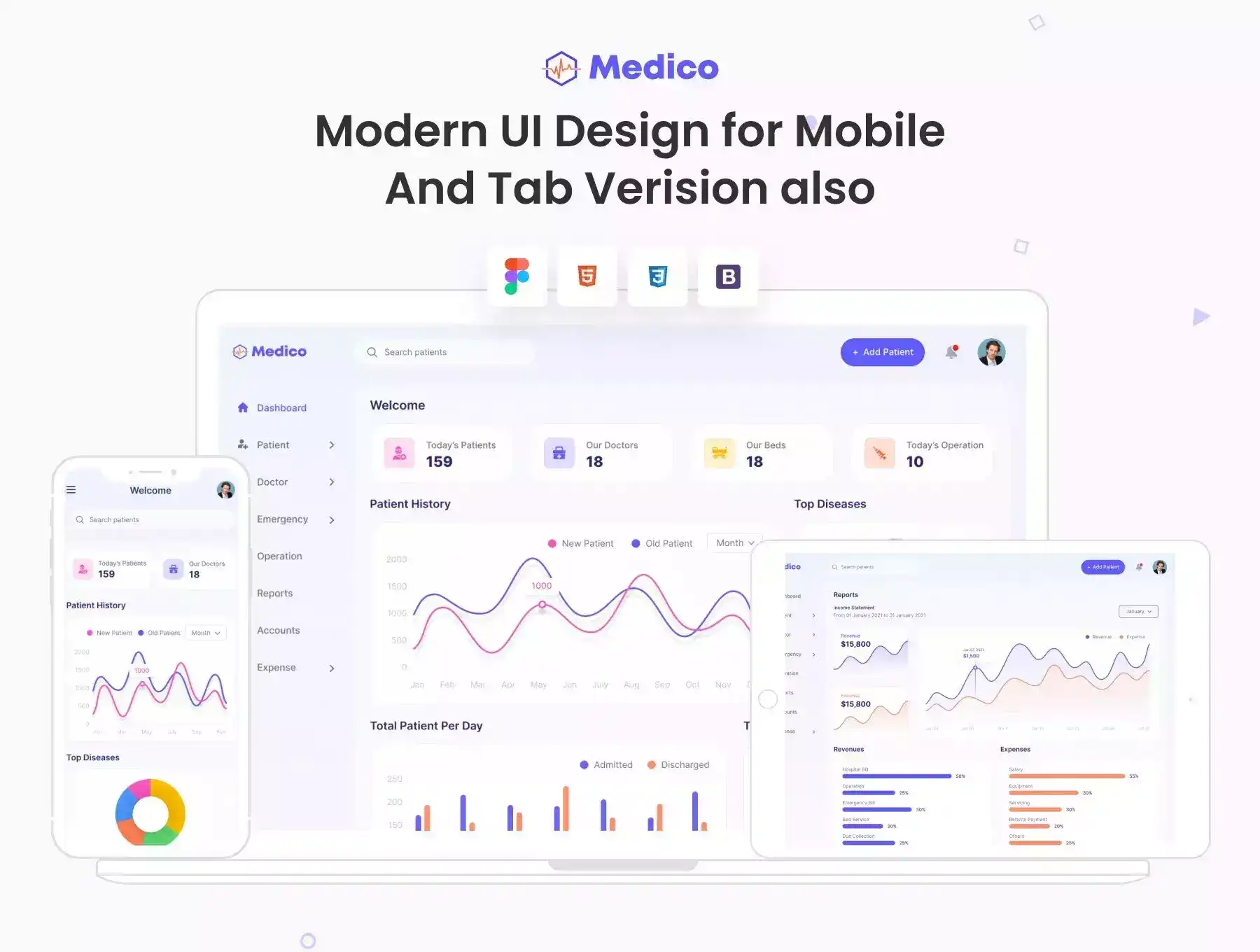Medico - Hospital Management System (Design+Code) Dashboard UI Kit for Figma and coded in HTML, CSS, Bootstrap, professionally designed and developed by Zainiklab.