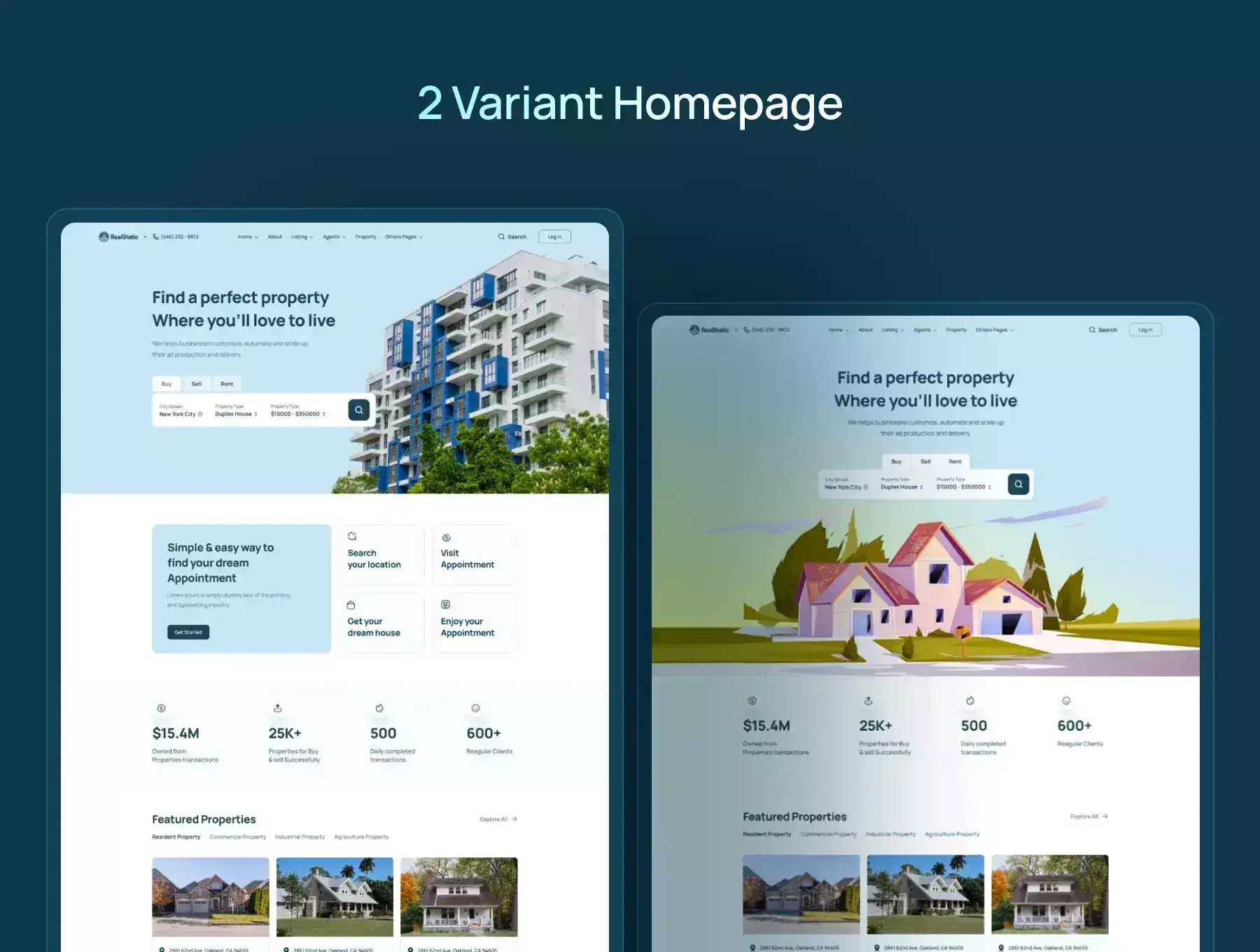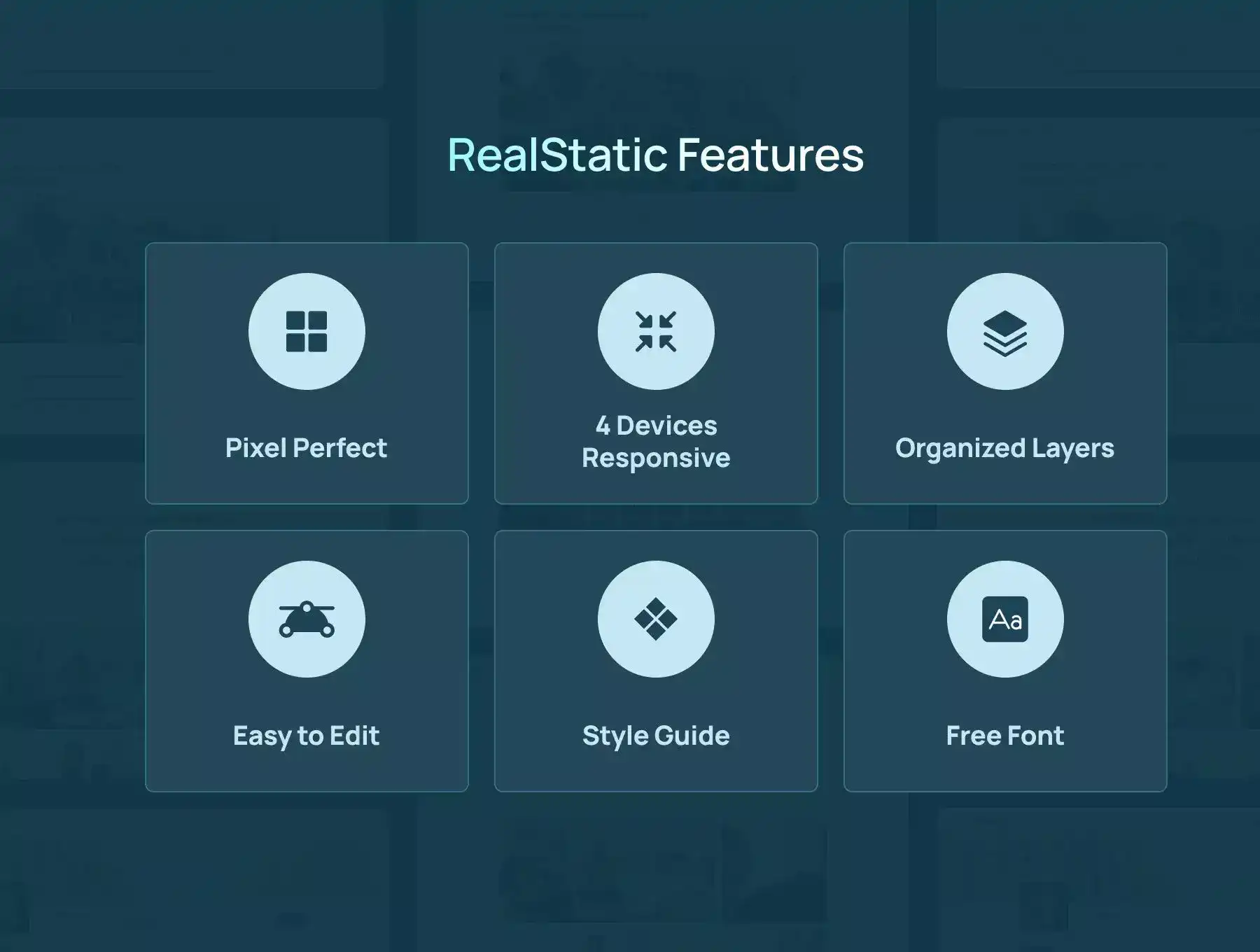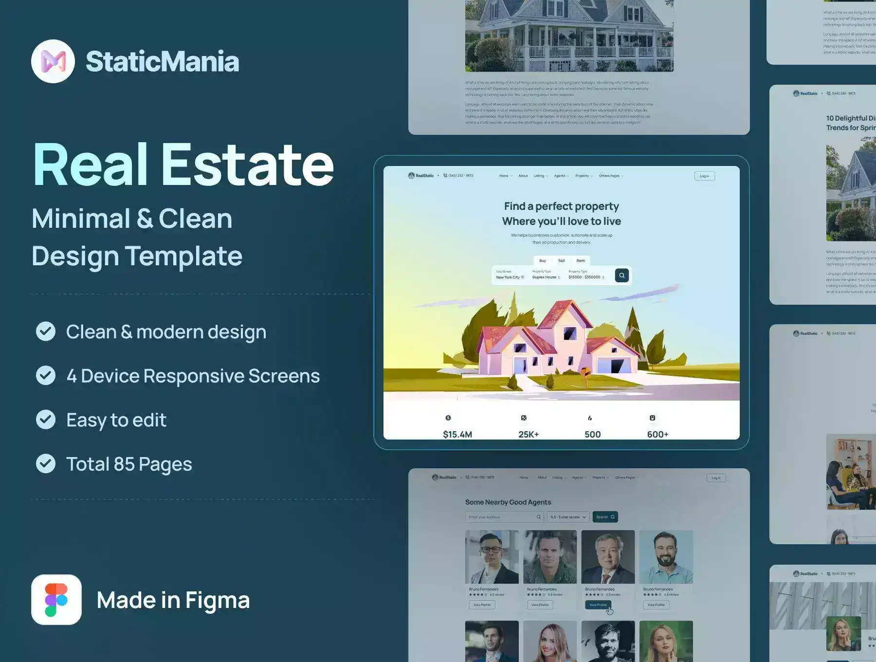 RealStatic is a real state design template with modern and clean looks. RealStatic gives you the power to build a good-looking real estate website for agents, agencies or companies. It has 18 different pages with 4 screens per page. Looking for a complete, modern & clean design for you next Real State project, RealStatic is a perfect choice for you.