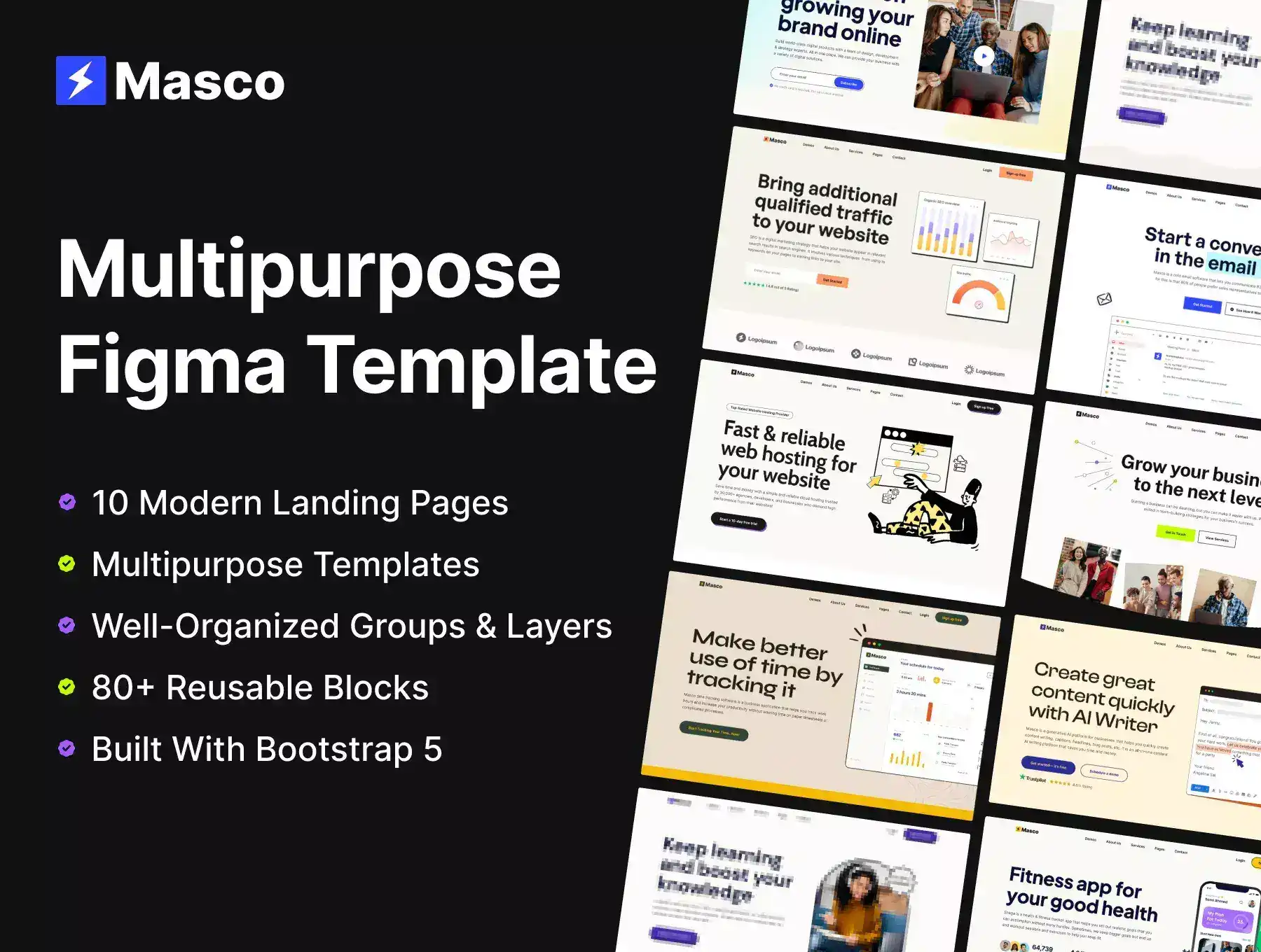 Masco is a multipurpose, professional, clean, creative, and easy-to-use Figma template that is suitable for all areas. It’s ideal for any company project, startup, agency, and coworking. You can edit easily this Figma, it’s 100% customizable. All shapes are resizable, with no quality loss, removable and editable.