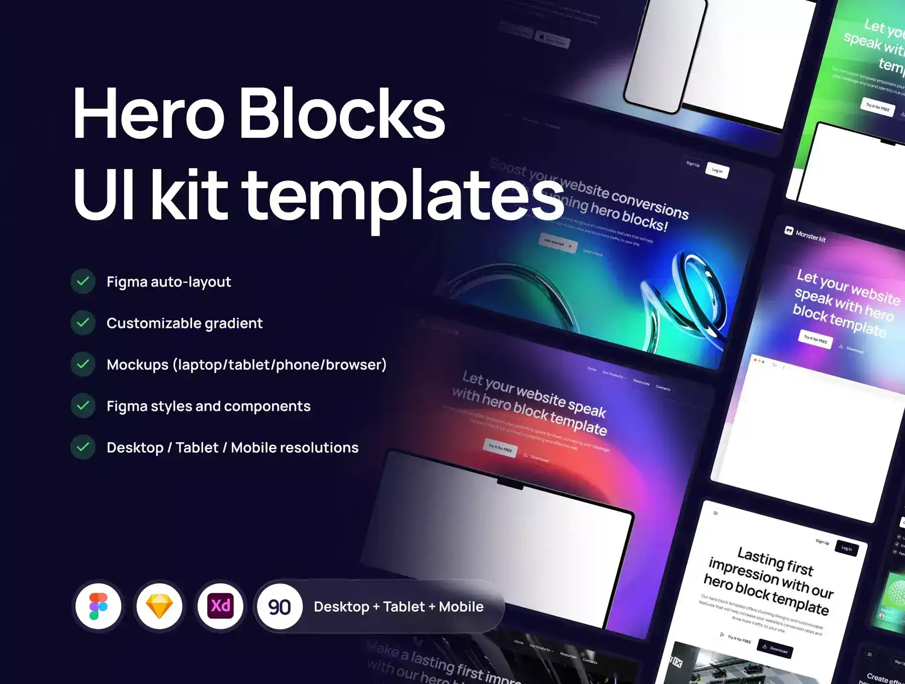 You have a unique opportunity to purchase our new UI Kit template, which is a set of 30 unique hero blocks designed for sites that support desktop, tablet and mobile versions. Our template is the ideal solution for designers who want to create stylish and modern websites.