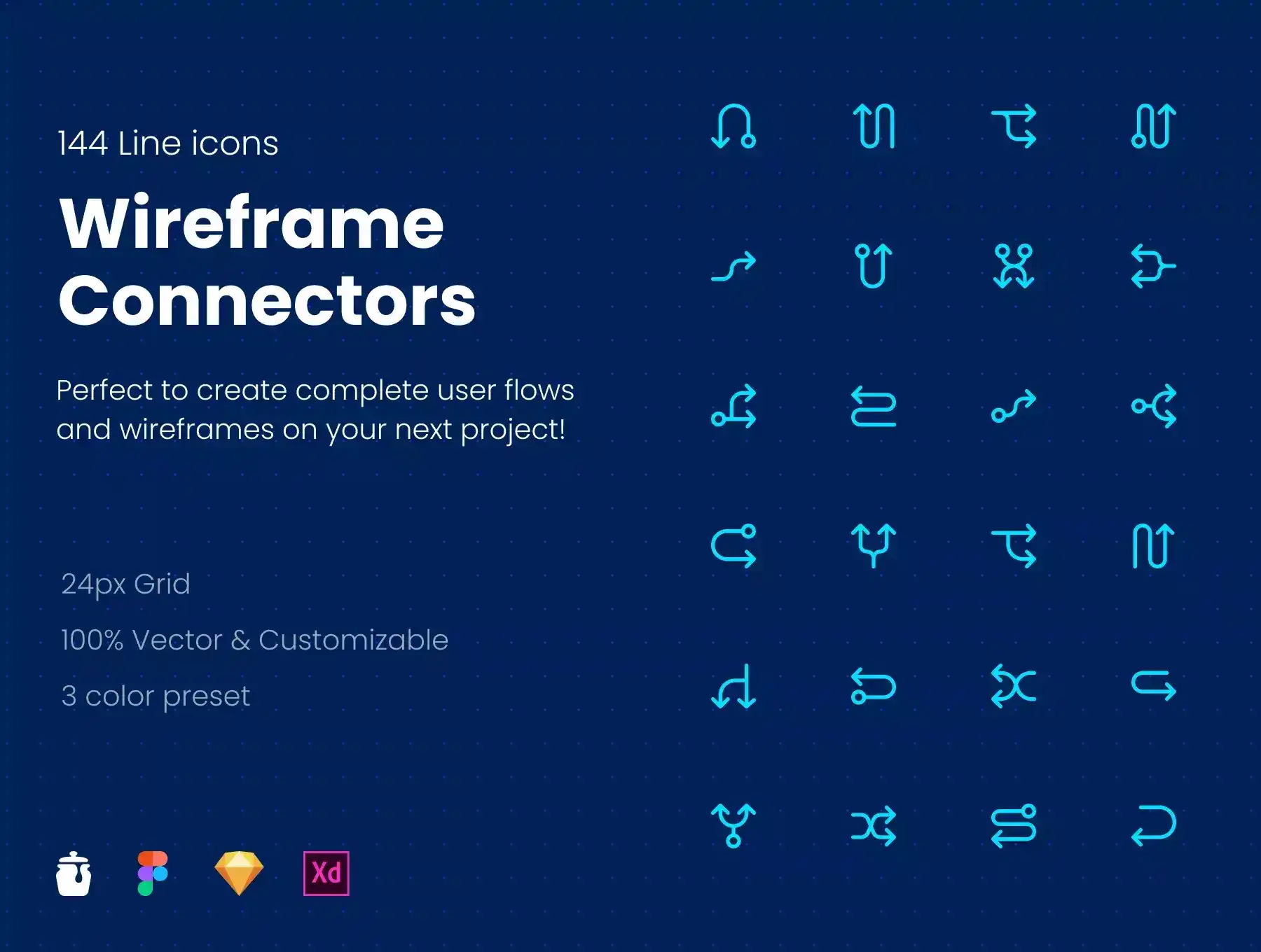 144 Icon Pack Wireframe Connectors is perfect for your next Design System, Wireframe, Website or iOS & Android Mobile App.