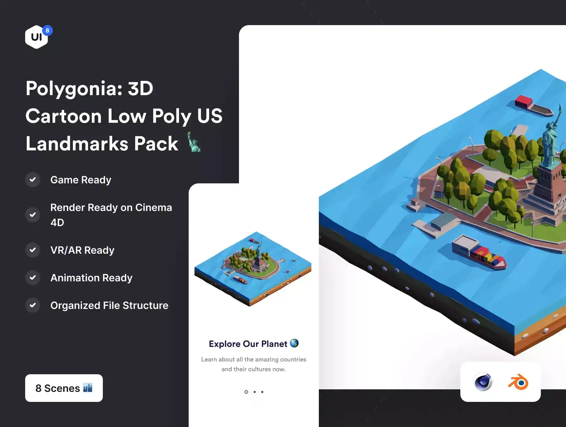 8 Items Pack Cartoon US Landmarks Low Poly Mega Pack 3d Asset