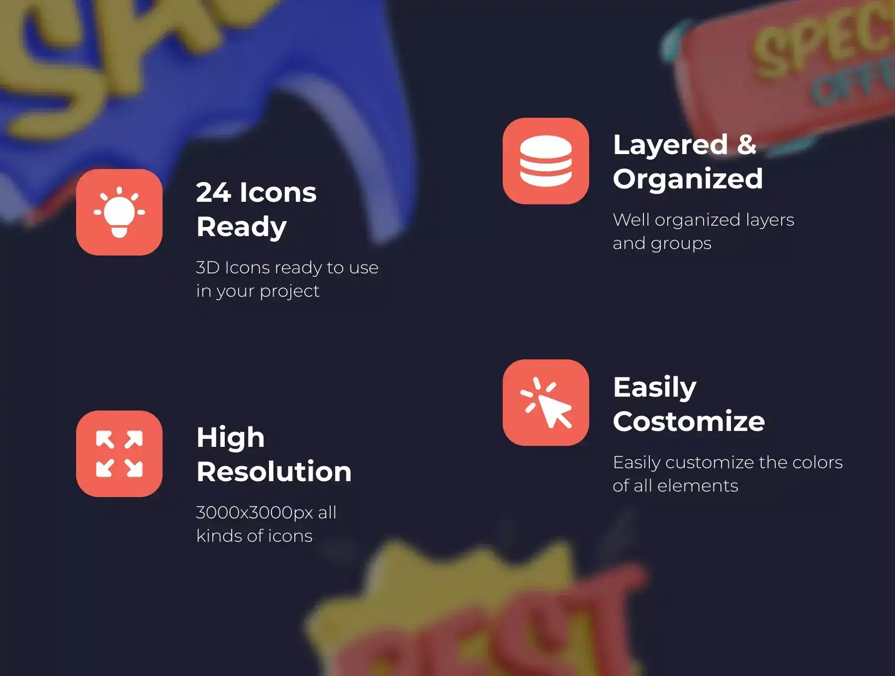 Commercially is a pack of custom 3D icons suitable for any products. This pack will perfectly complement the design of your app, presentation, website, etc. The kit includes stickers such as: SALE, BLACK FRIDAY, SPECIAL OFFER, SPECIAL EDITION, CASH BACK, SHOPPING DAY, BEST and etc. Create stunning, unique projects with these hand crafted icons, easily editable in Figma, and fully customizable in Blender.