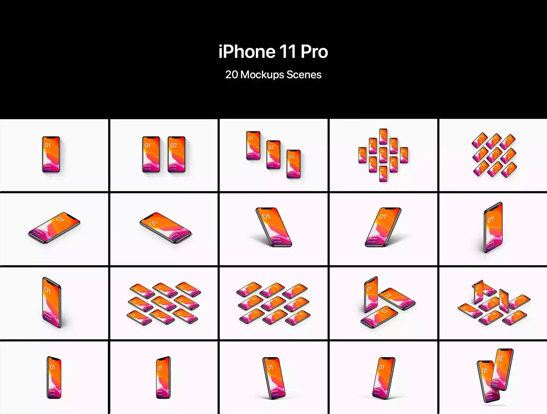 Includes iPhone Pro 11 - 20 Scenes PSD high quality files (All the scenes that you will see in the second picture they already included in the purchase).