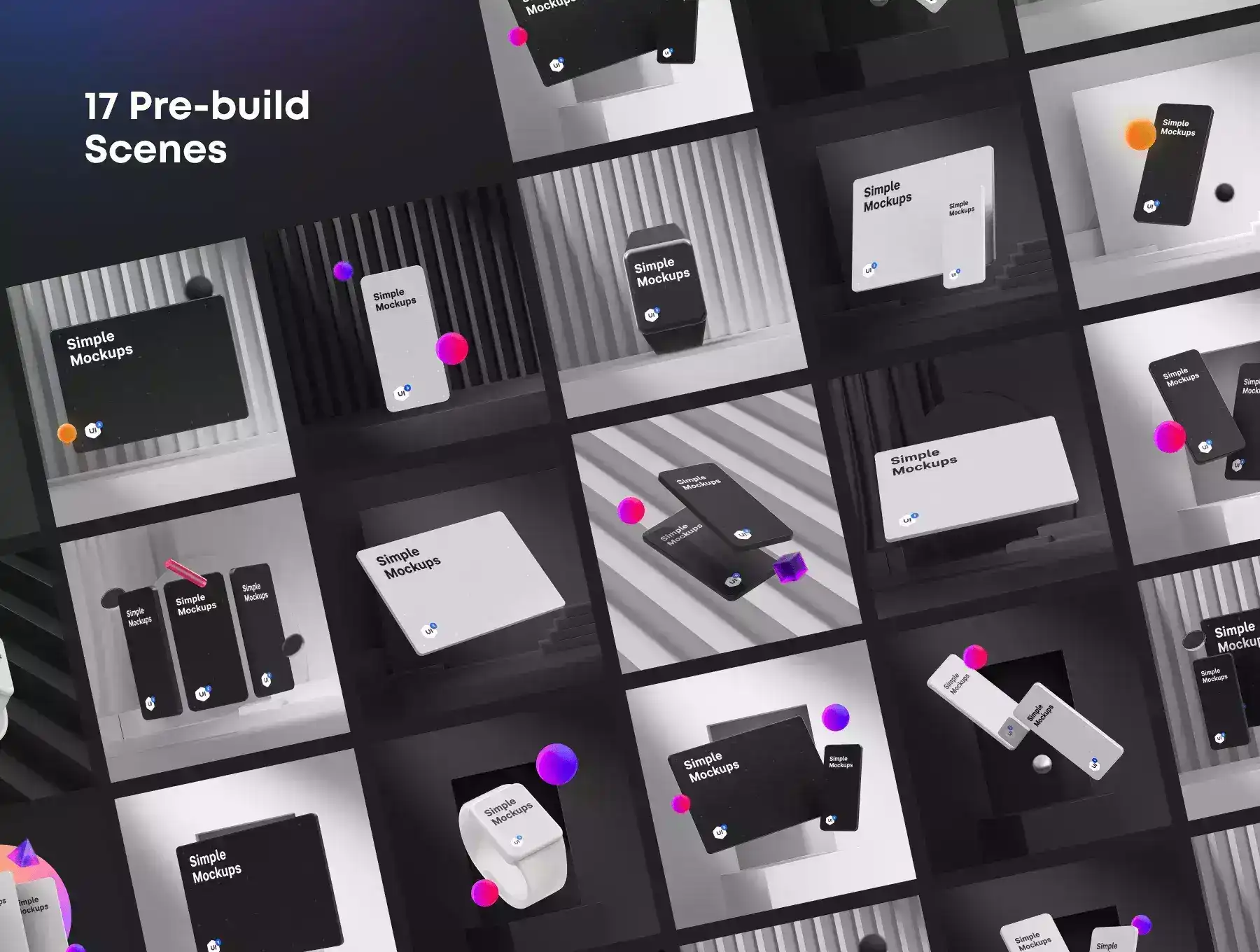 You can mix-and-match different objects in Figma to create your own scenes and simply apply your UI designs using the Mockup plug-in or fully modify the scenes with the Cinema4D or the subtly animated After Effect files (new).